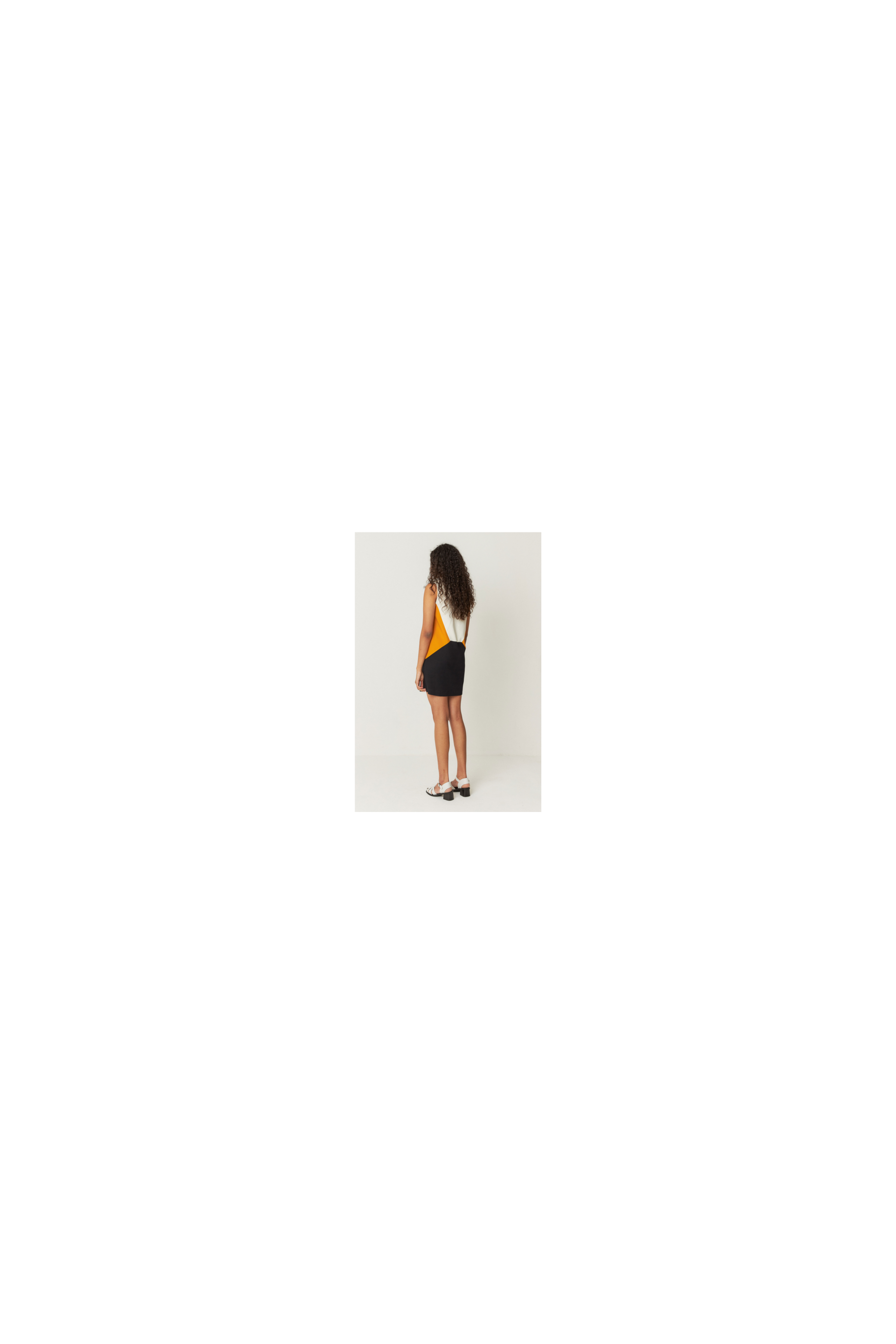 Sleeveless dress cut above the knee with contrasting colours. Slips on easily and is made from GOTS-certified organic cotton knit.