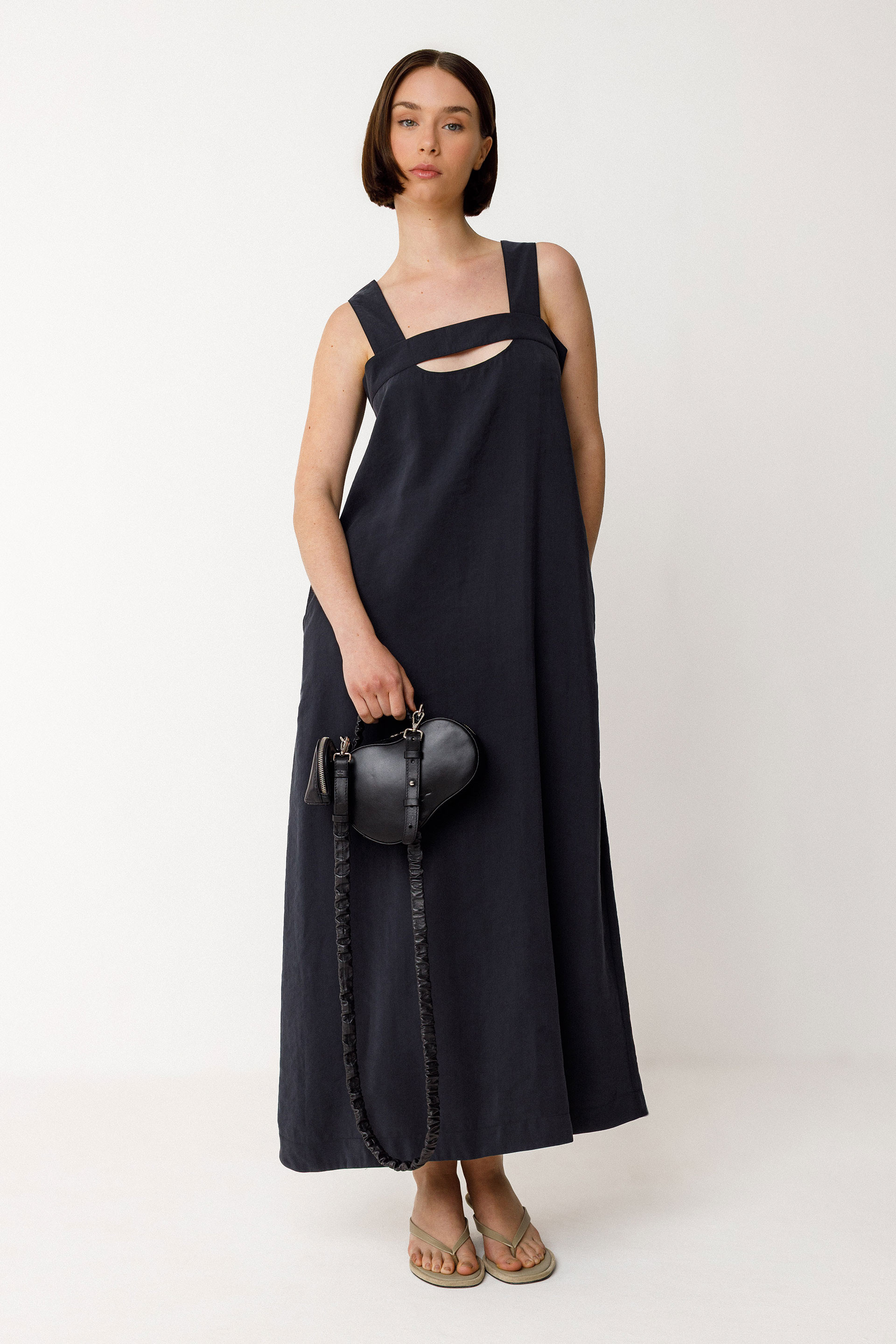 Leather bag with an organic shape. Featuring handles and a zip closure, it is lined in cotton with an interior zip pocket. Size: 20 cm x 14 cm.