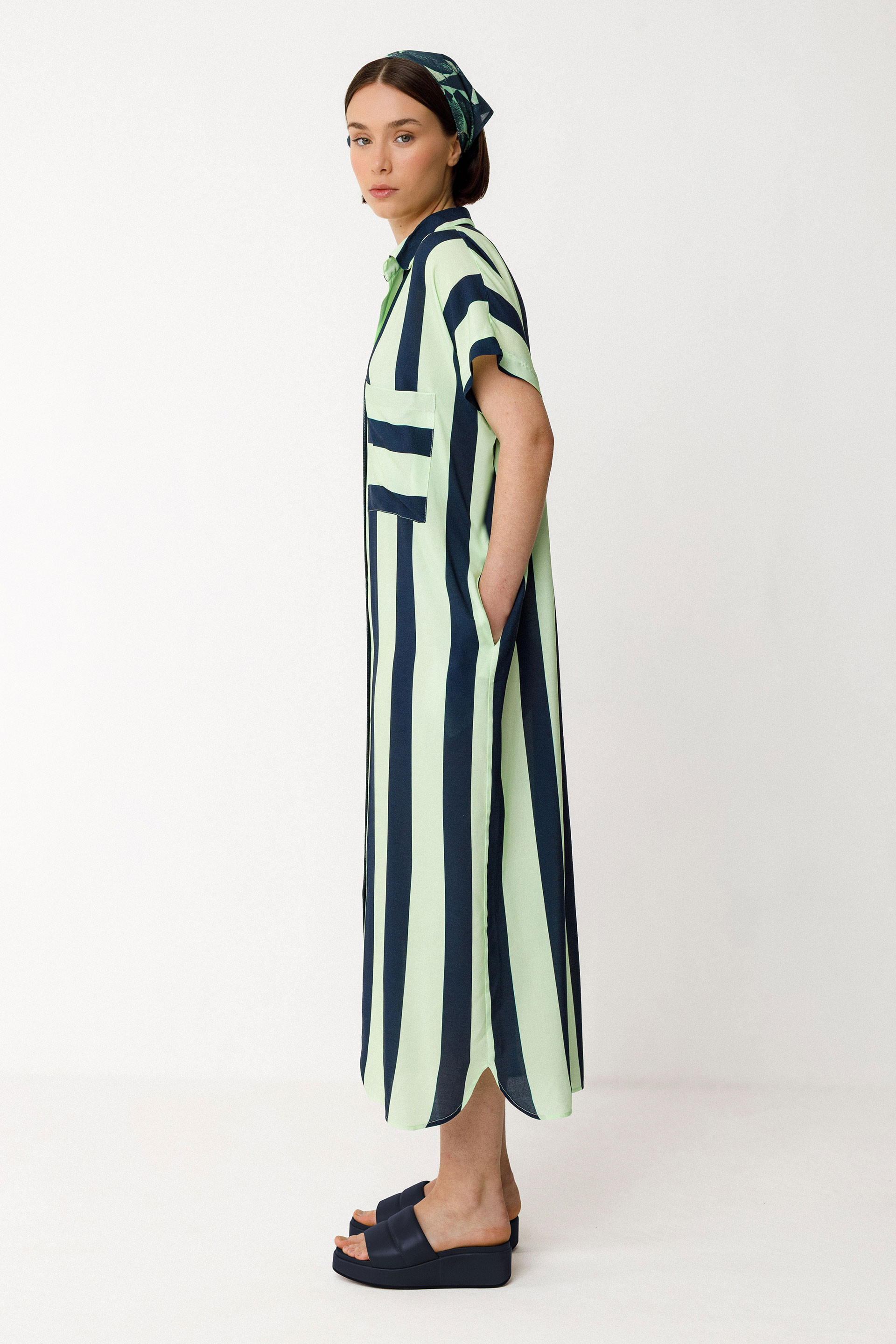 Long, loose-fitting sleeveless shirt dress. It has a button closure at the front, a classic collar, a chest pocket, and hand pockets.