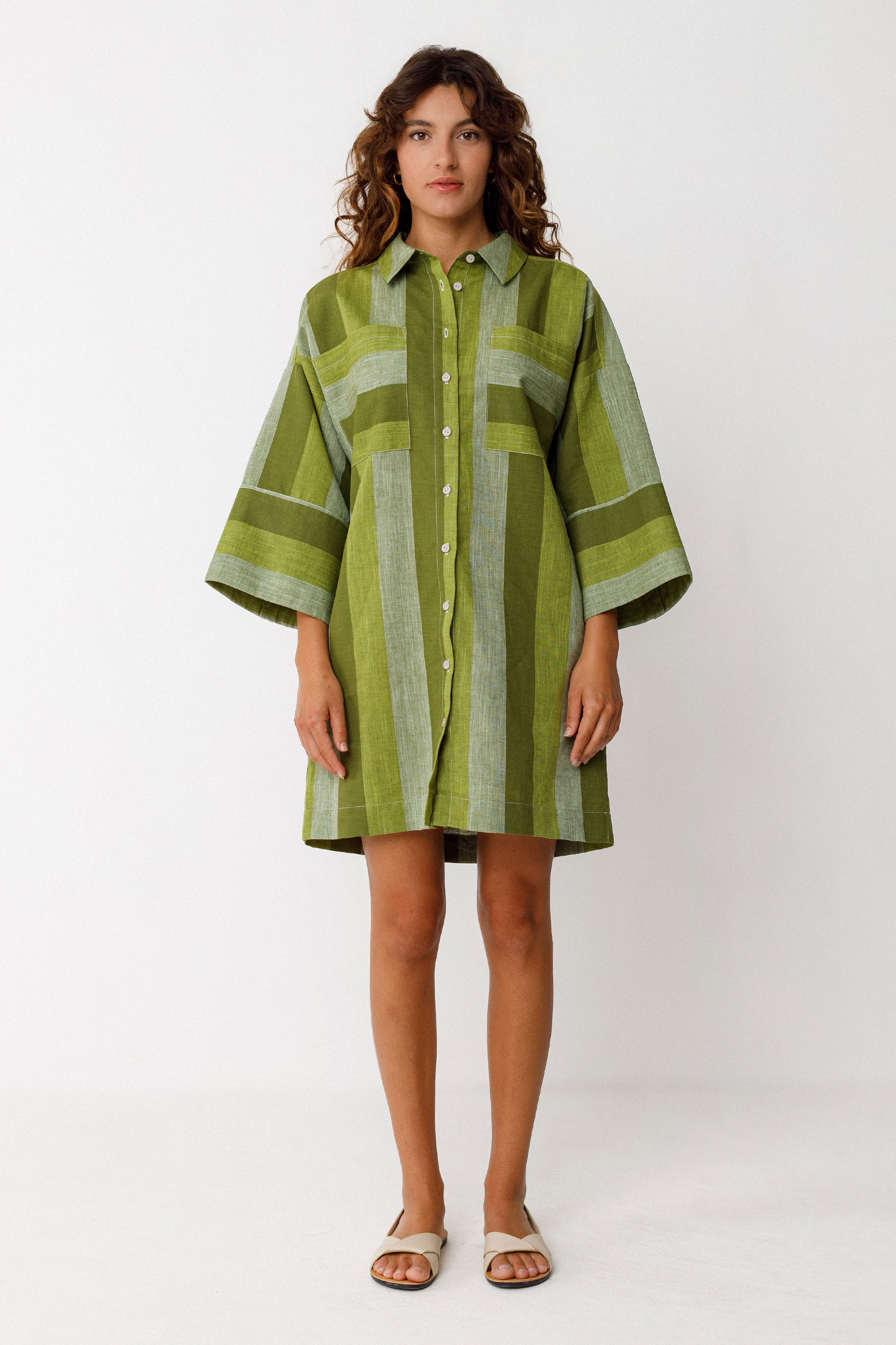 Short, loose-fitting shirt dress with dropped shoulders and a classic collar. Chest and side pockets, along with box pleats at the back.