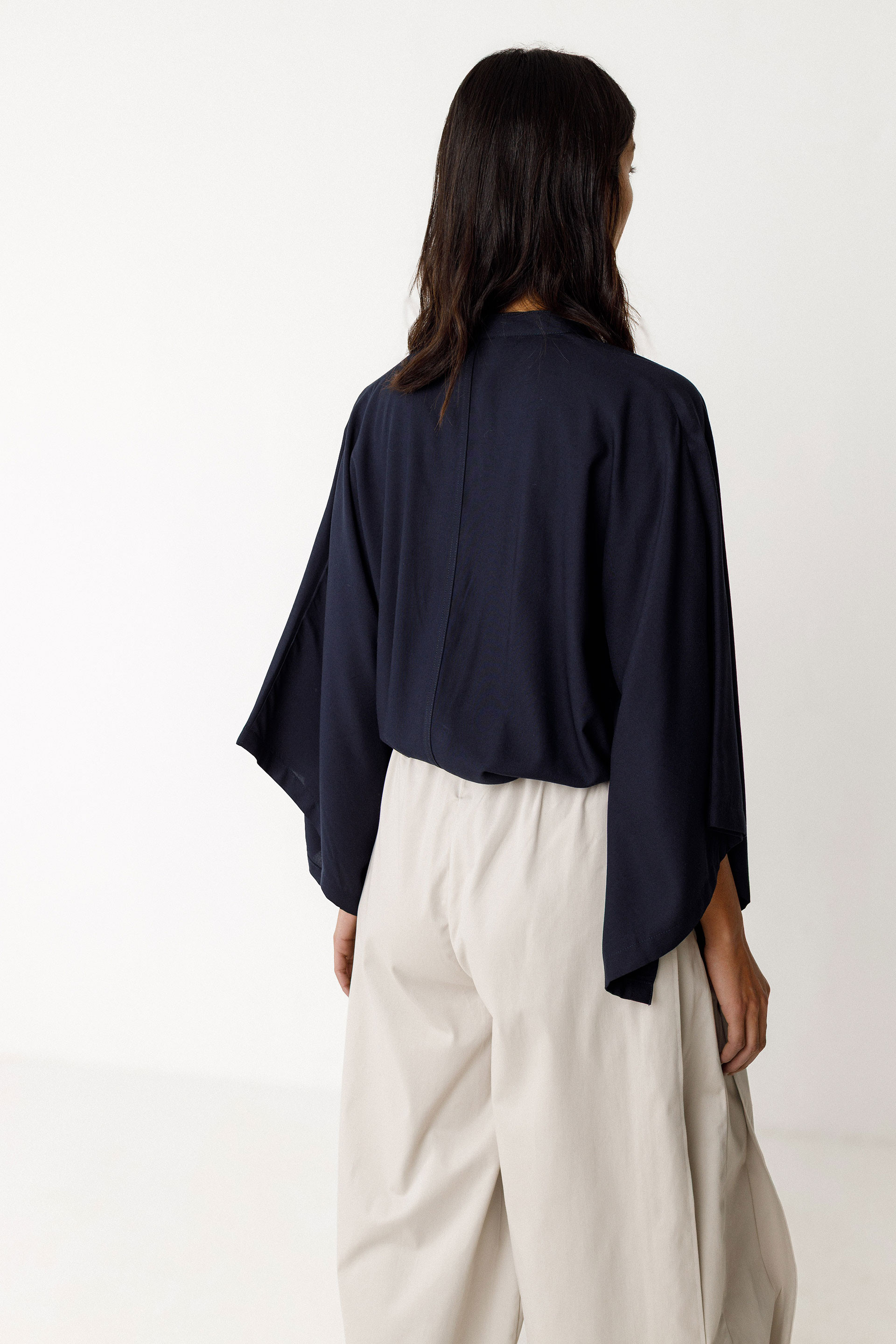 Oversized shirt with Mandarin collar and 3/4-length kimono sleeves. Button closure at the front.