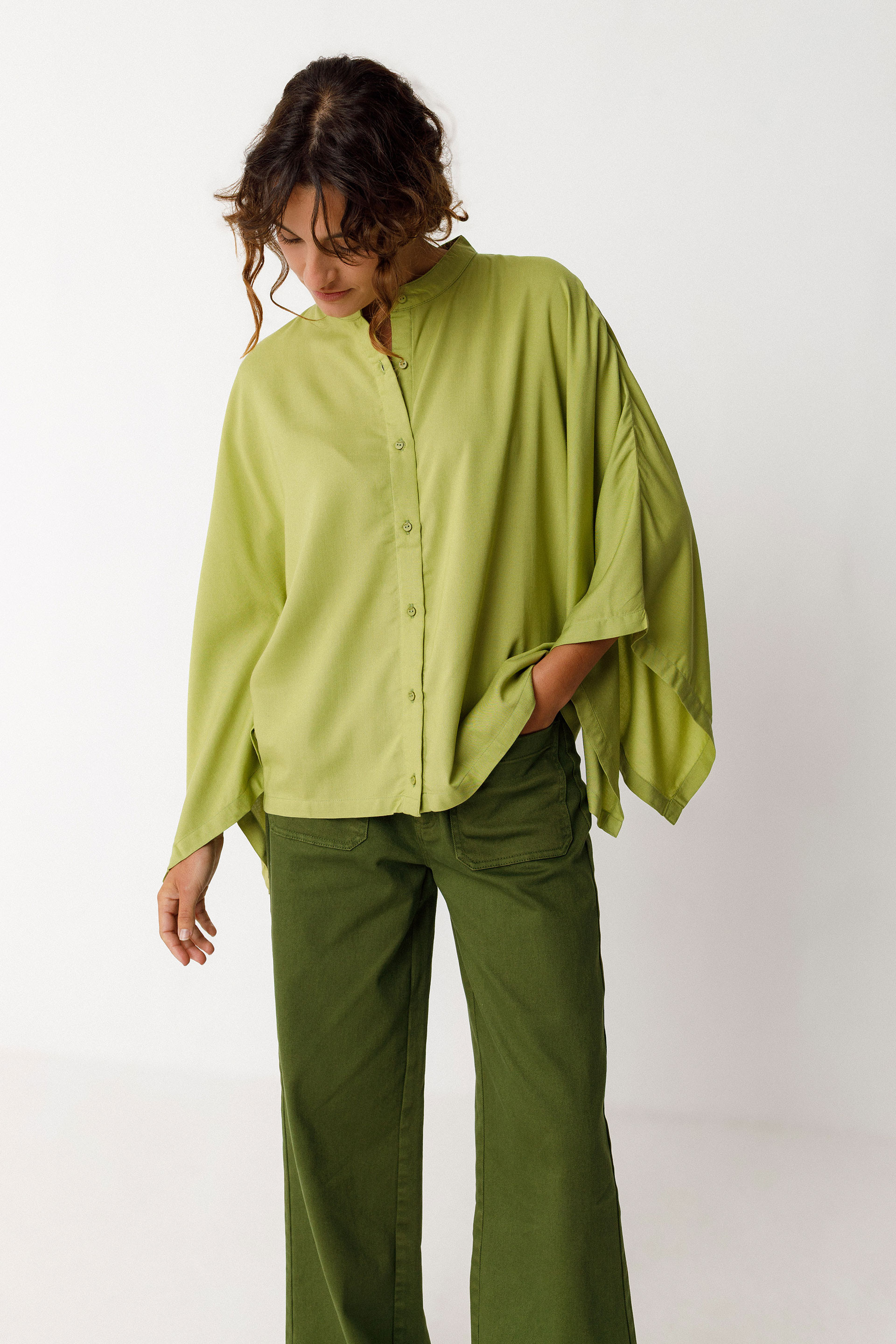 Oversized shirt with Mandarin collar and 3/4-length kimono sleeves. Button closure at the front.