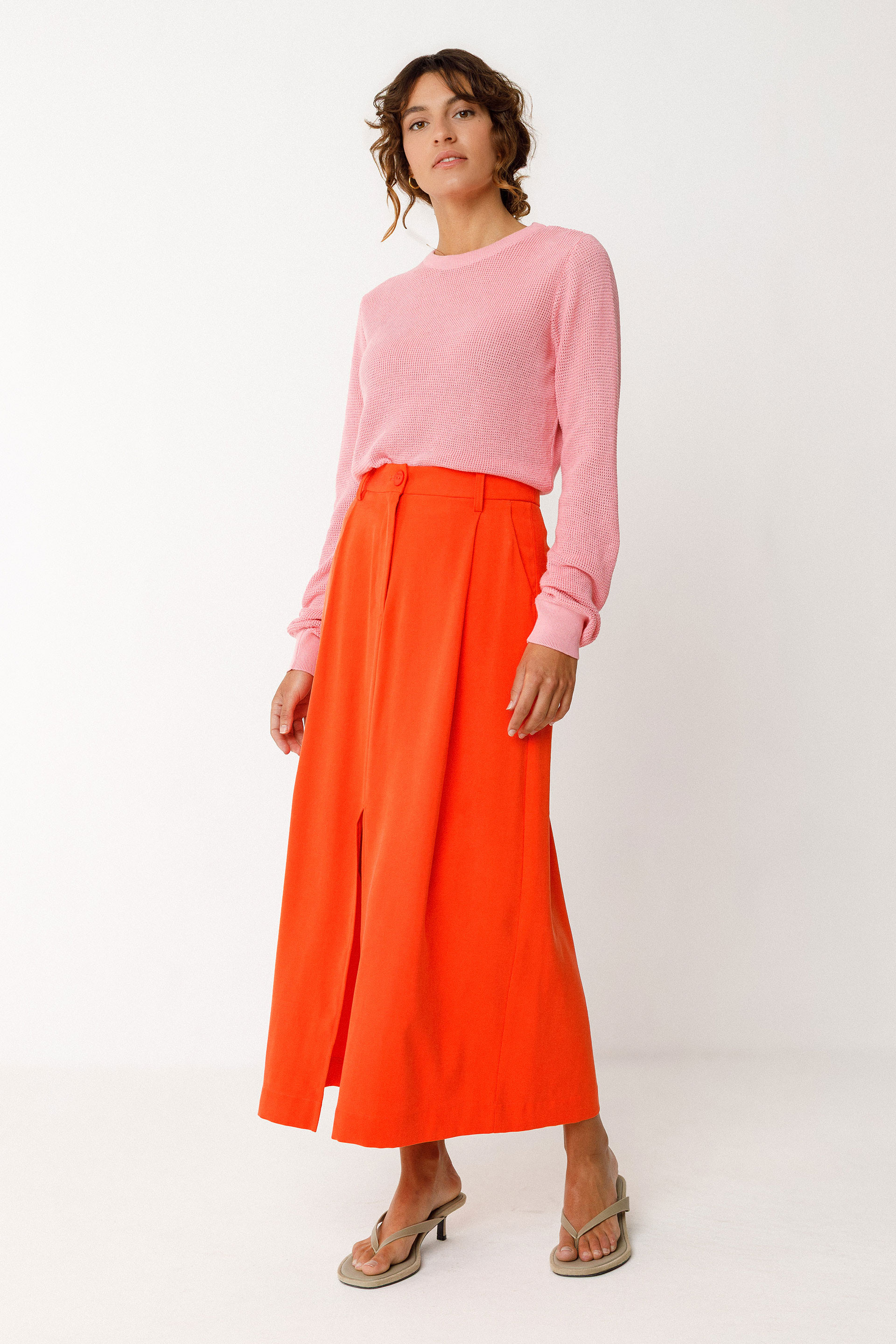 A-line midi skirt with a slit at the front. It features a zip fly and slanted front pockets. Orange.