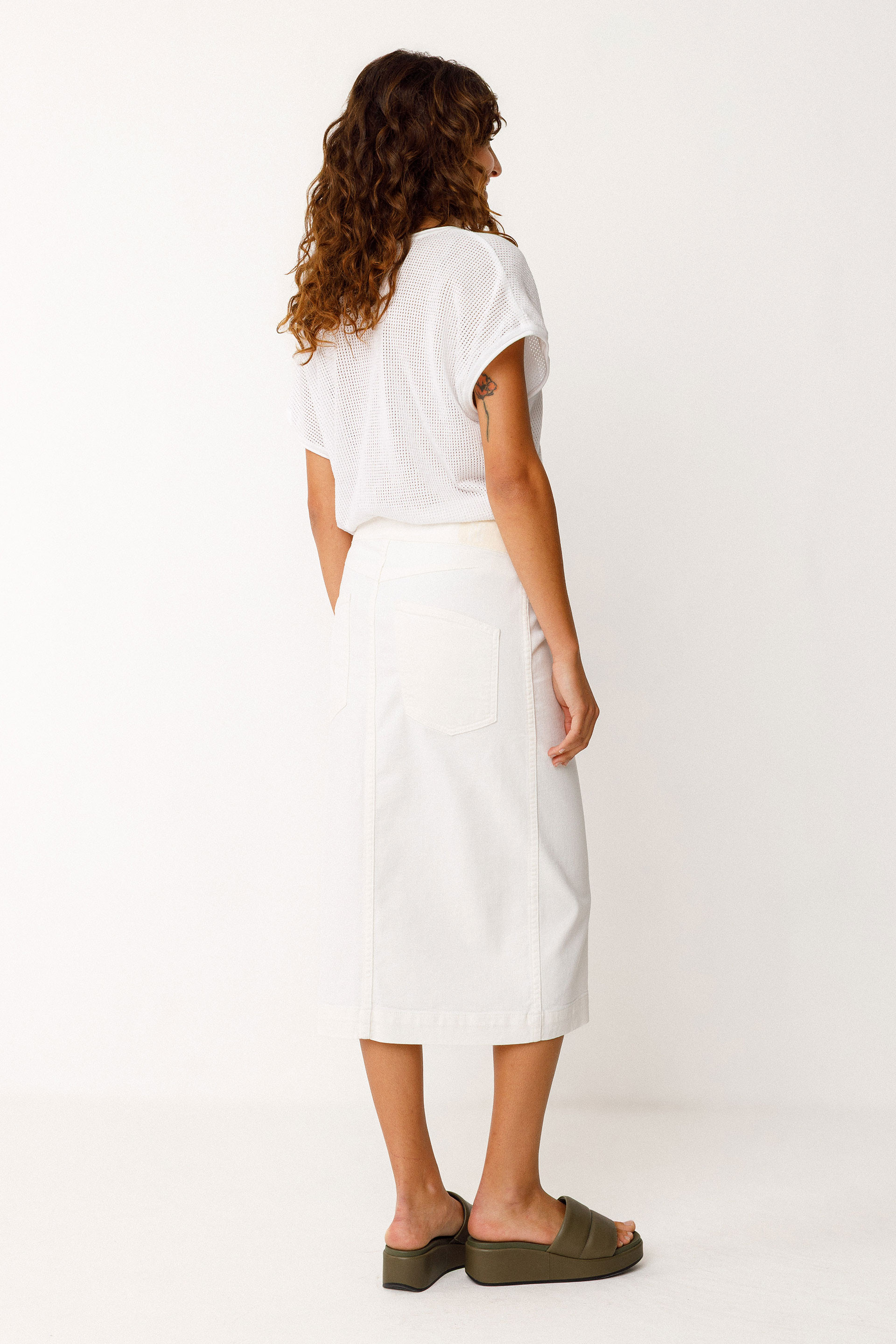Midi-length pencil skirt with a front zip closure and back patch pockets.
