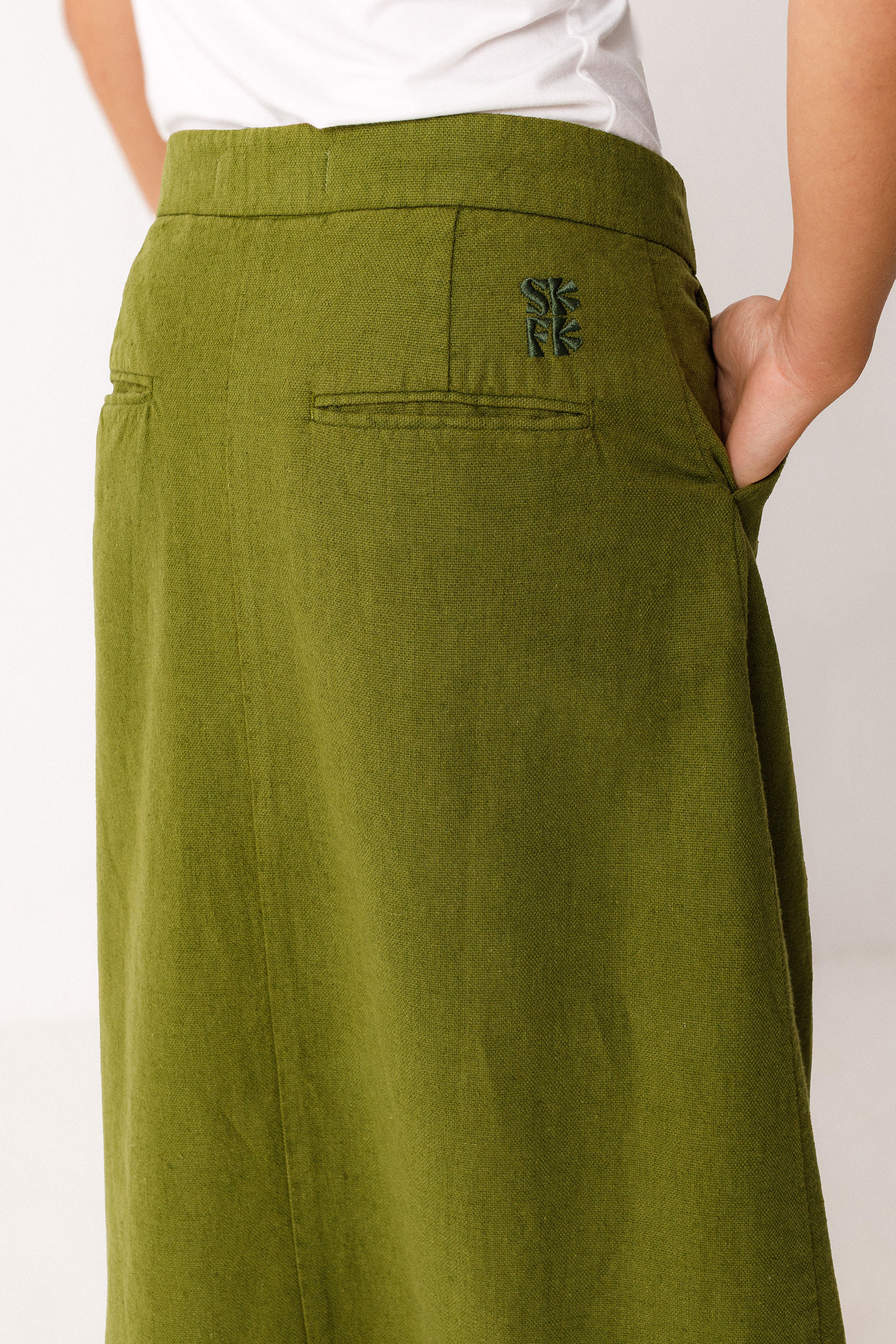 A-line midi skirt with a front zip fly, side pockets, and a centre-front slit.