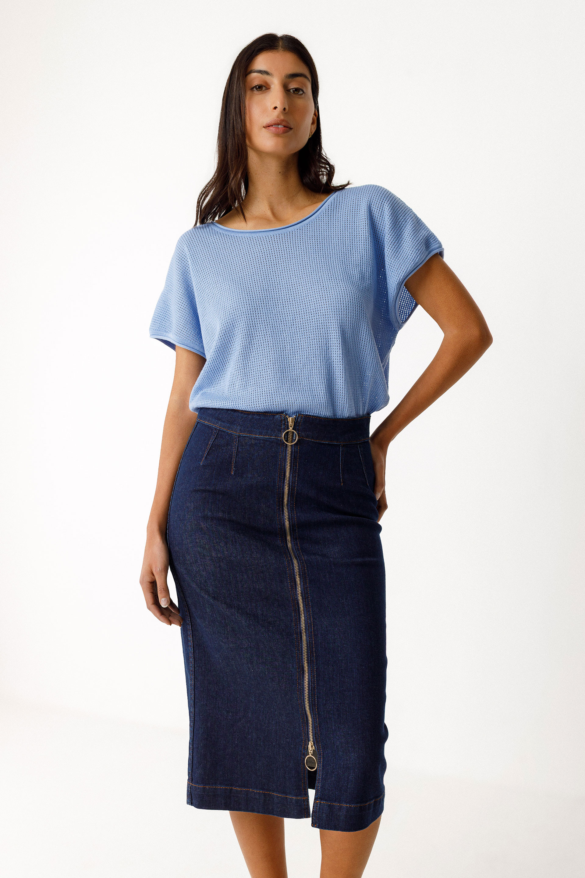 Midi-length pencil skirt with a front zip closure and back patch pockets.
