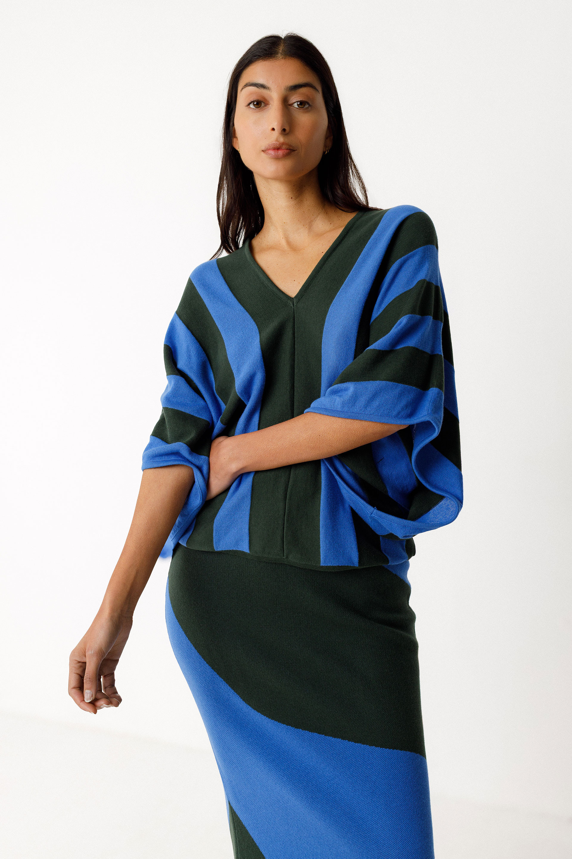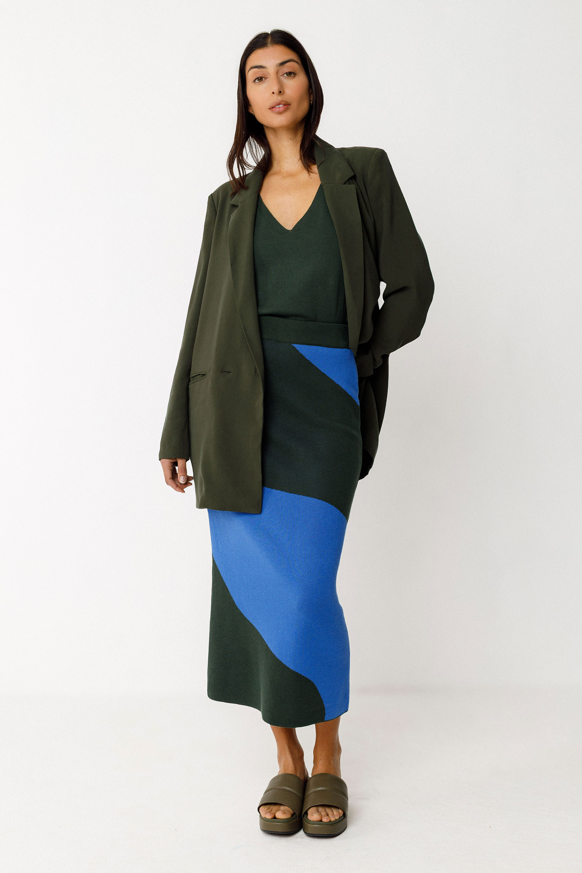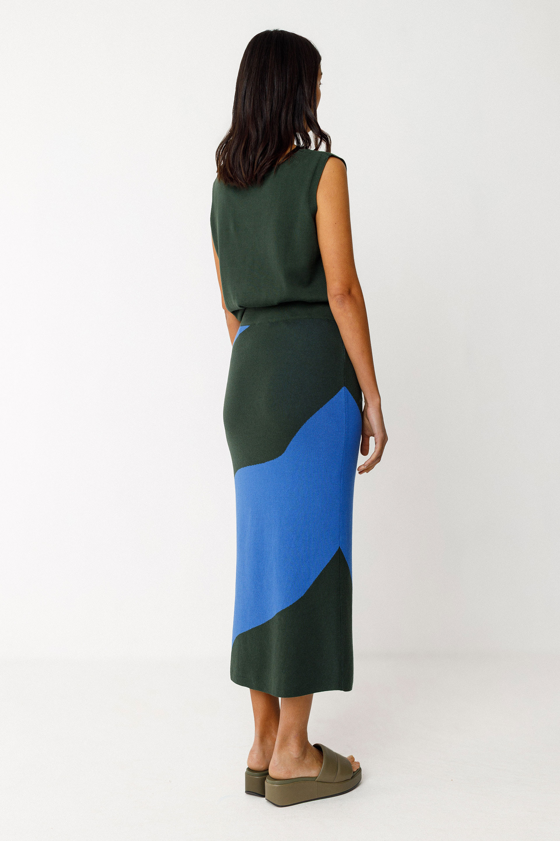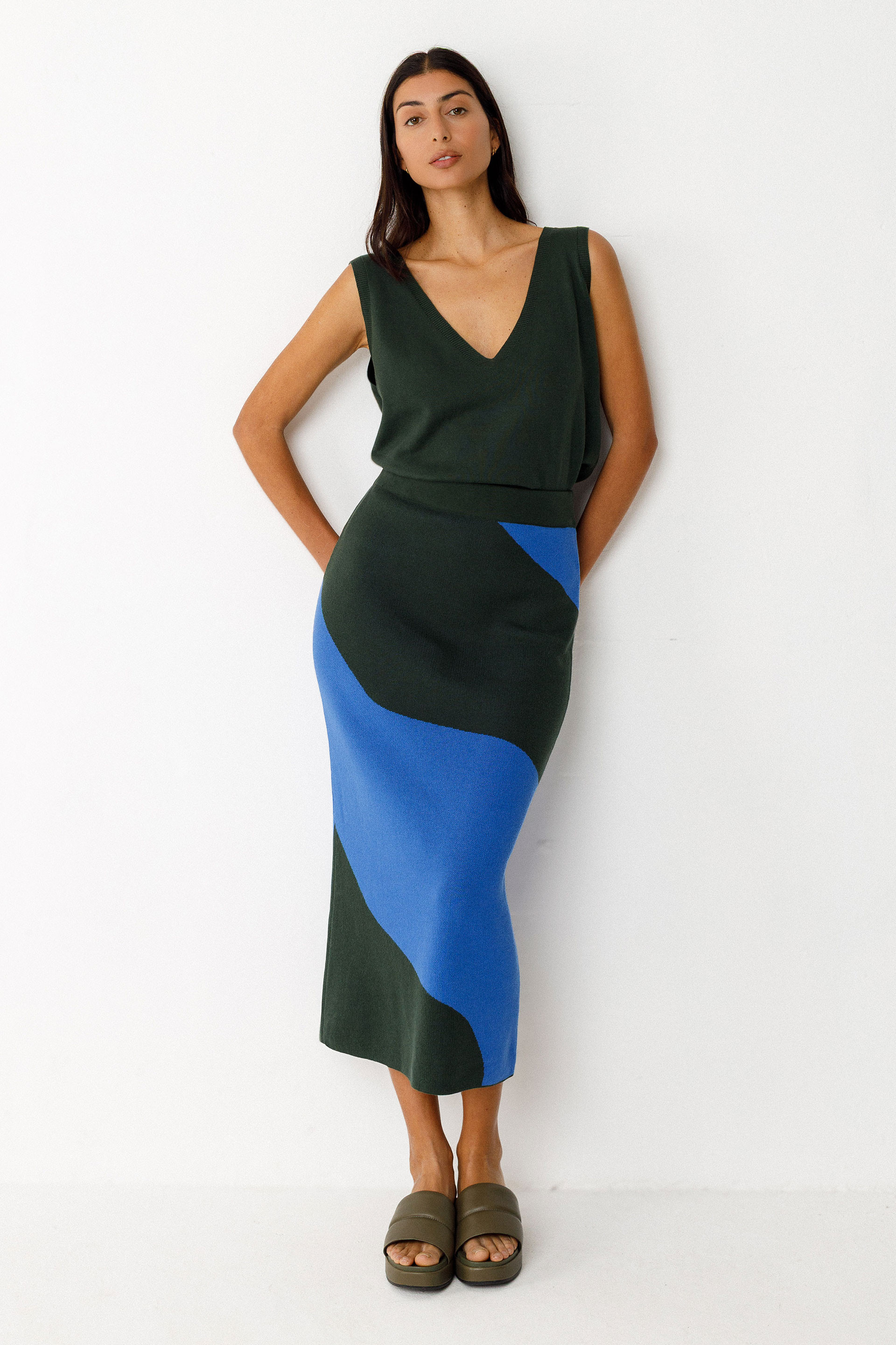 Fitted midi pencil skirt with an elastic waistband. Made from lightweight GOTS-certified organic cotton knit.