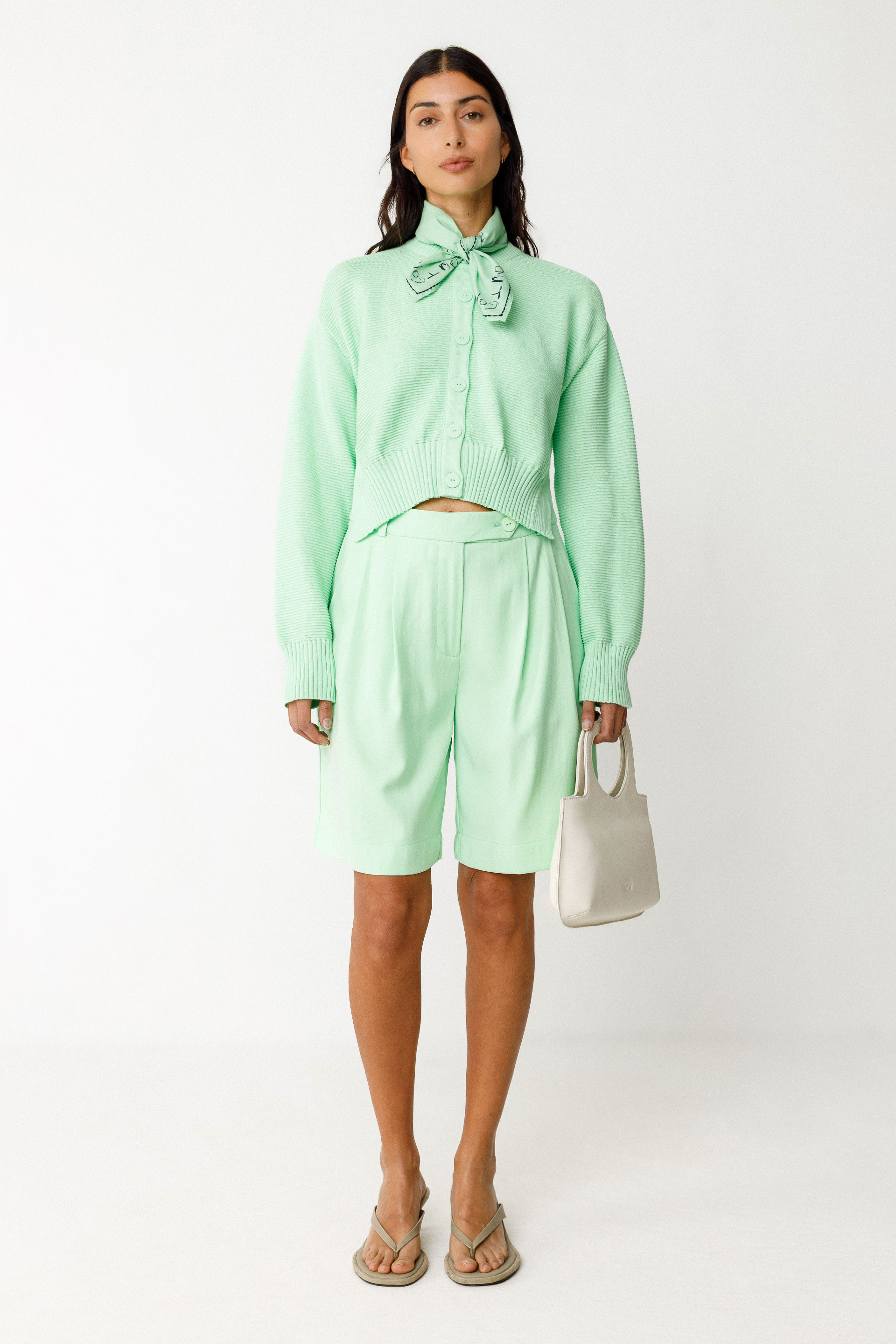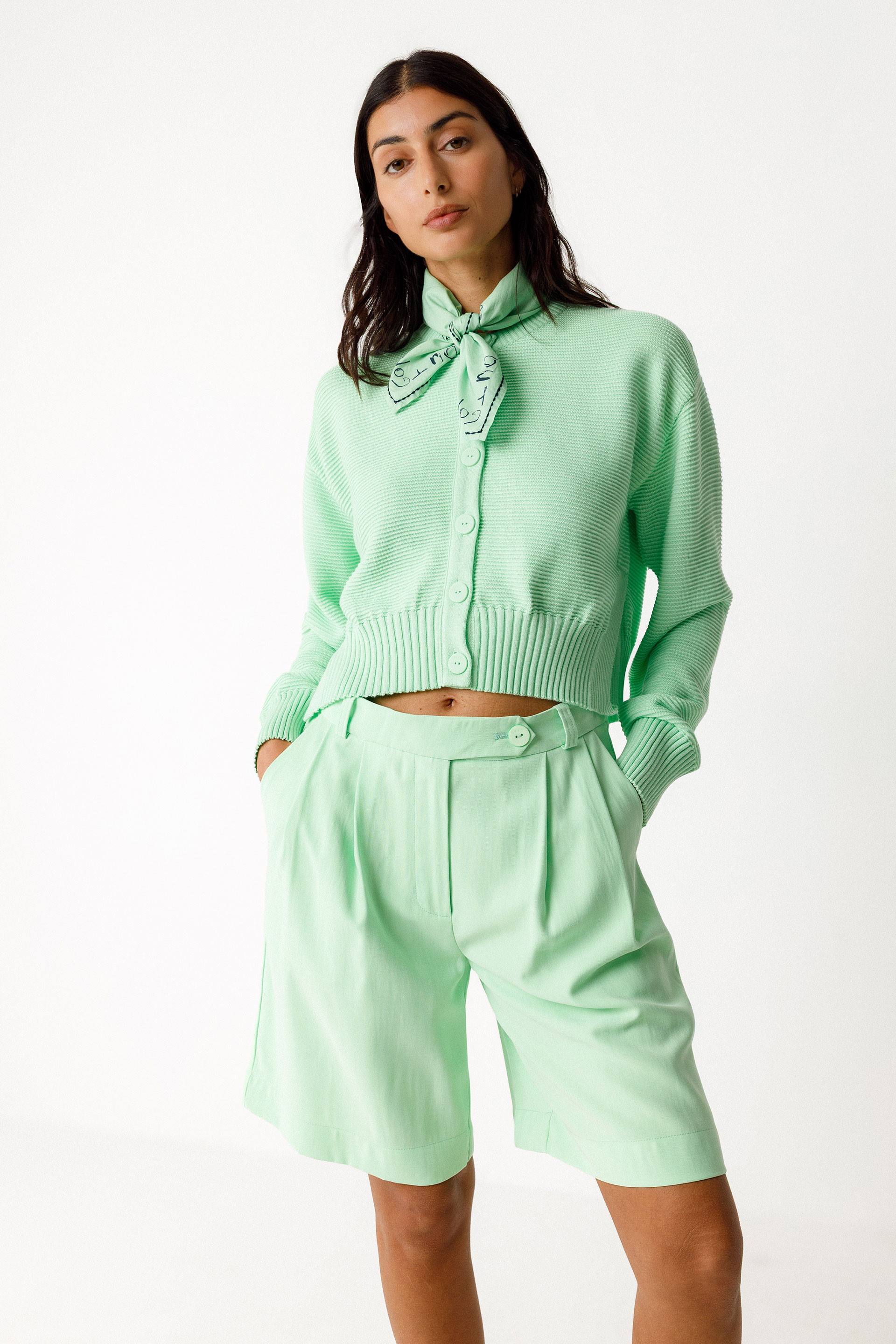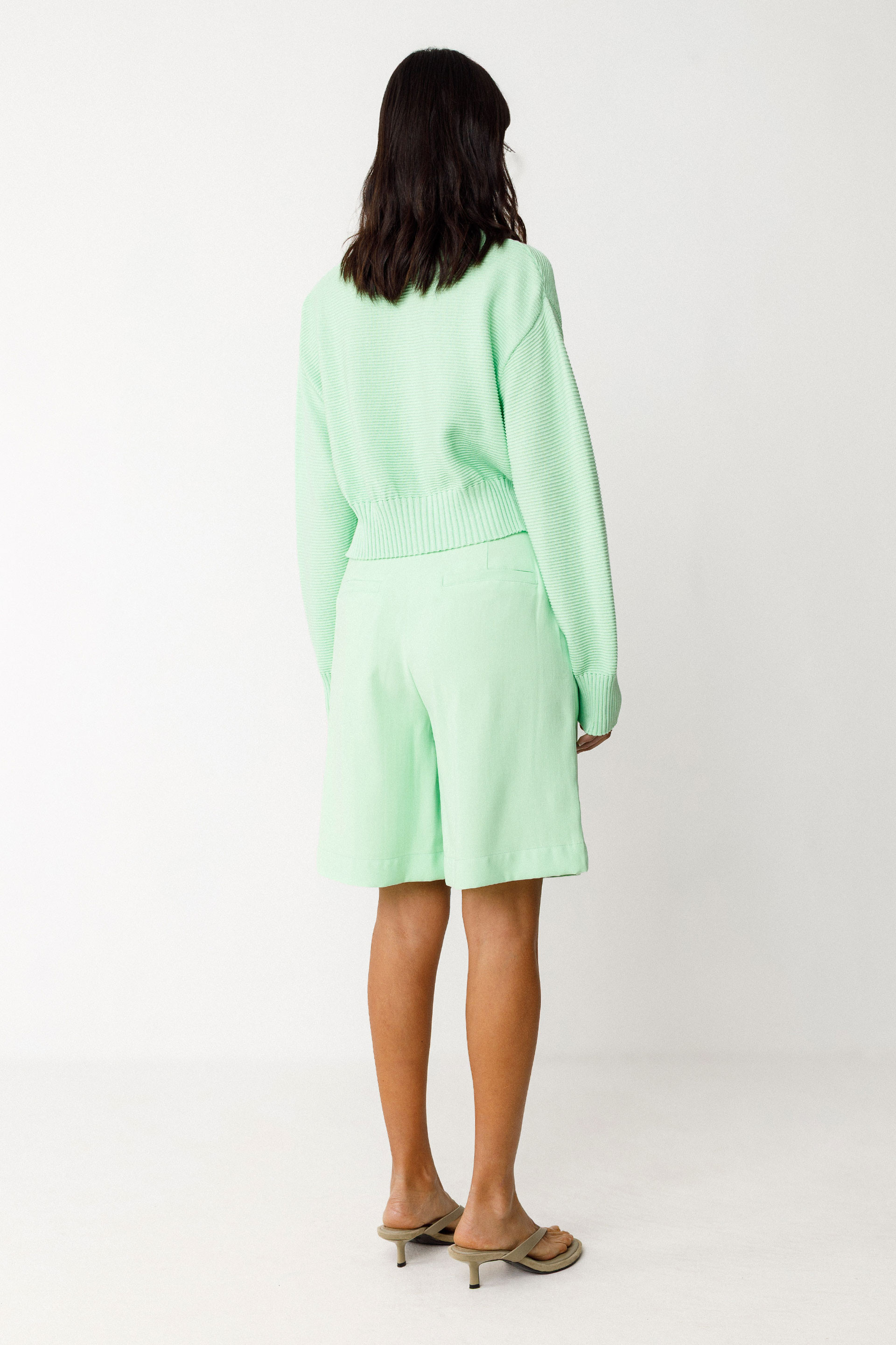 Straight-cut bermuda shorts with a classic waist. Zip fly with button closure. Slanted front pockets and decorative welt pockets at the back. Leg length: 51 cm (size 38).