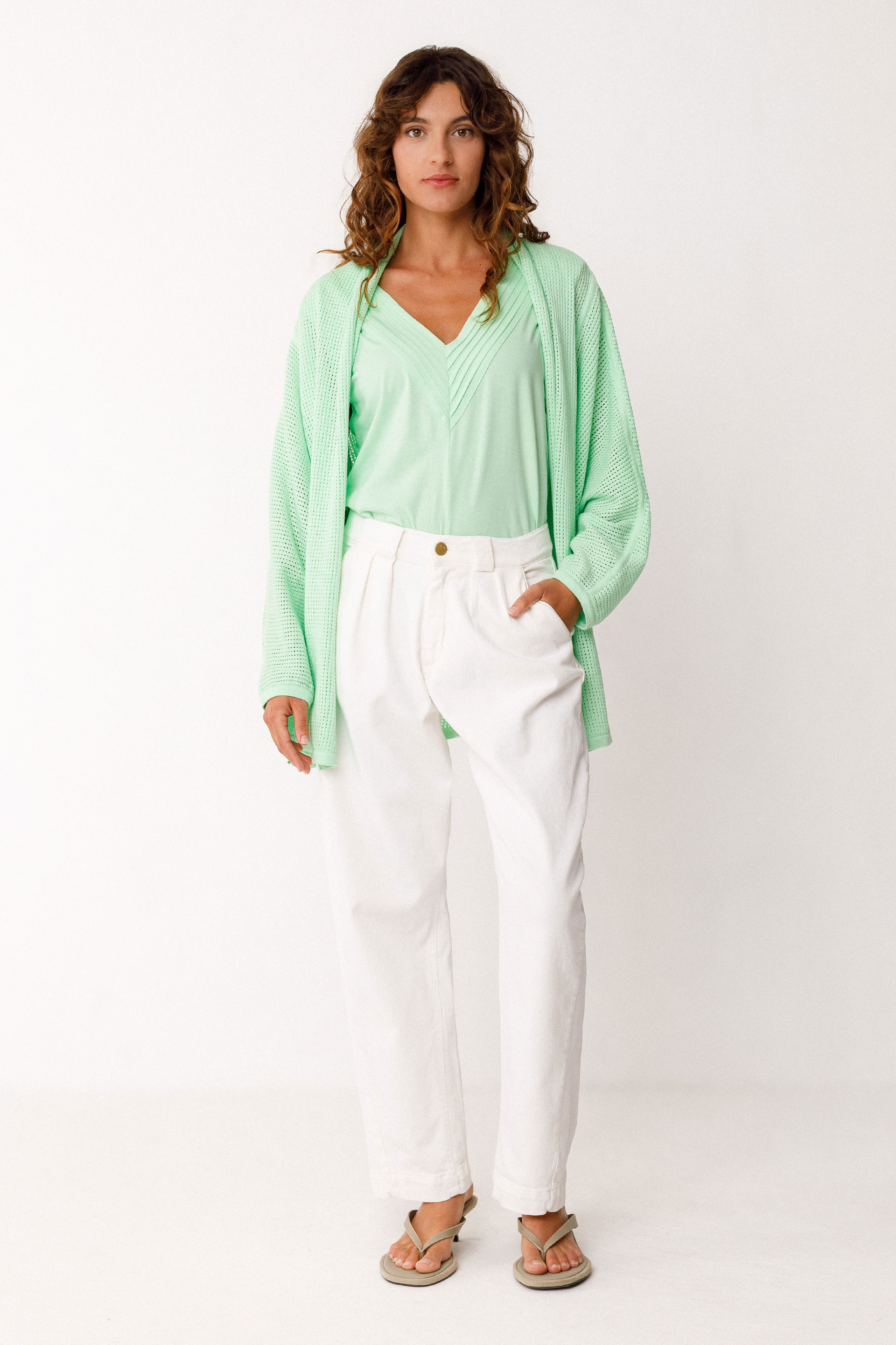 Loose-fitting, long cardigan in lightweight textured knit. Meant to be worn open and made from GOTS-certified organic cotton.