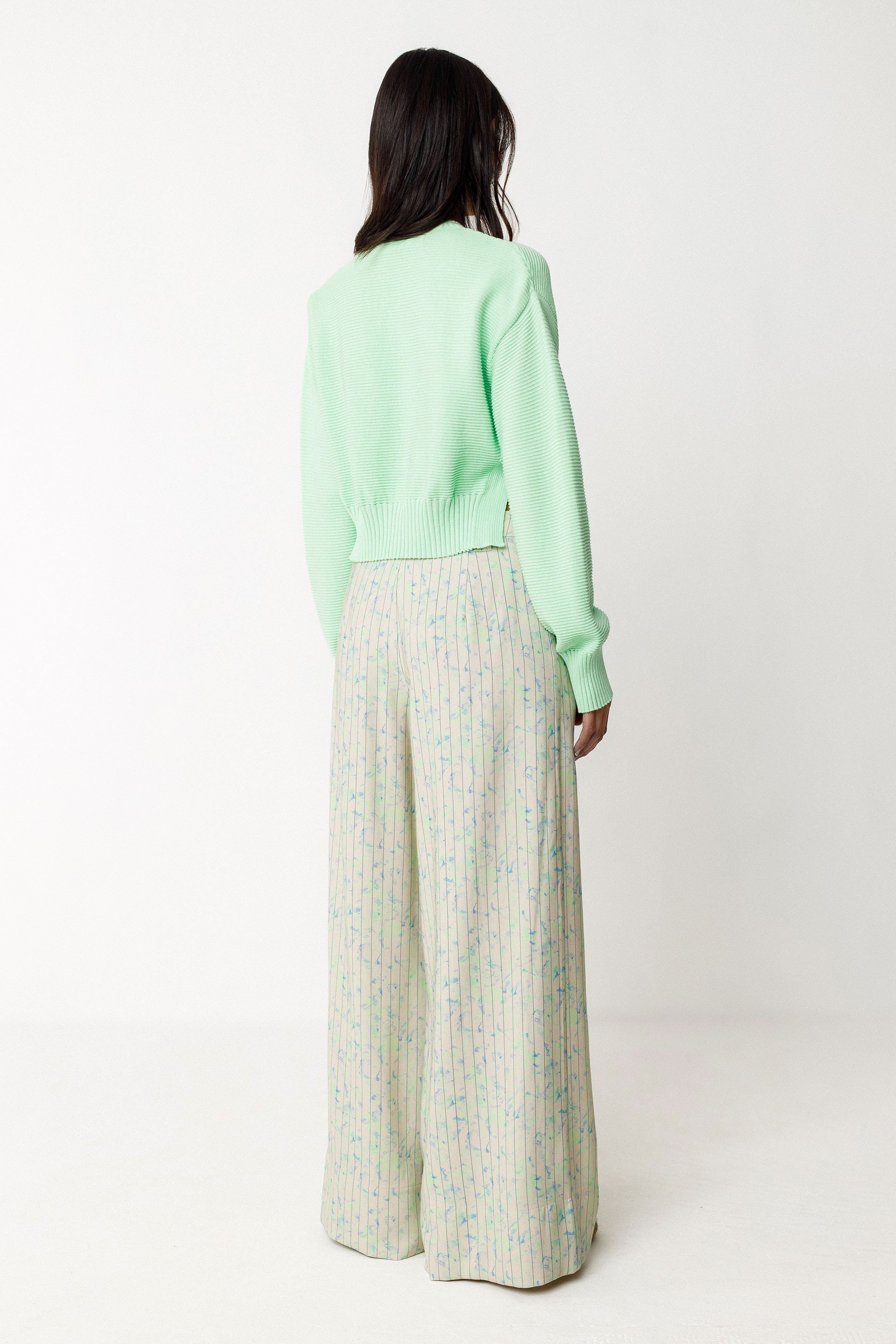 Short cardigan in lightweight knit with a round neckline, button closure, and side slits.