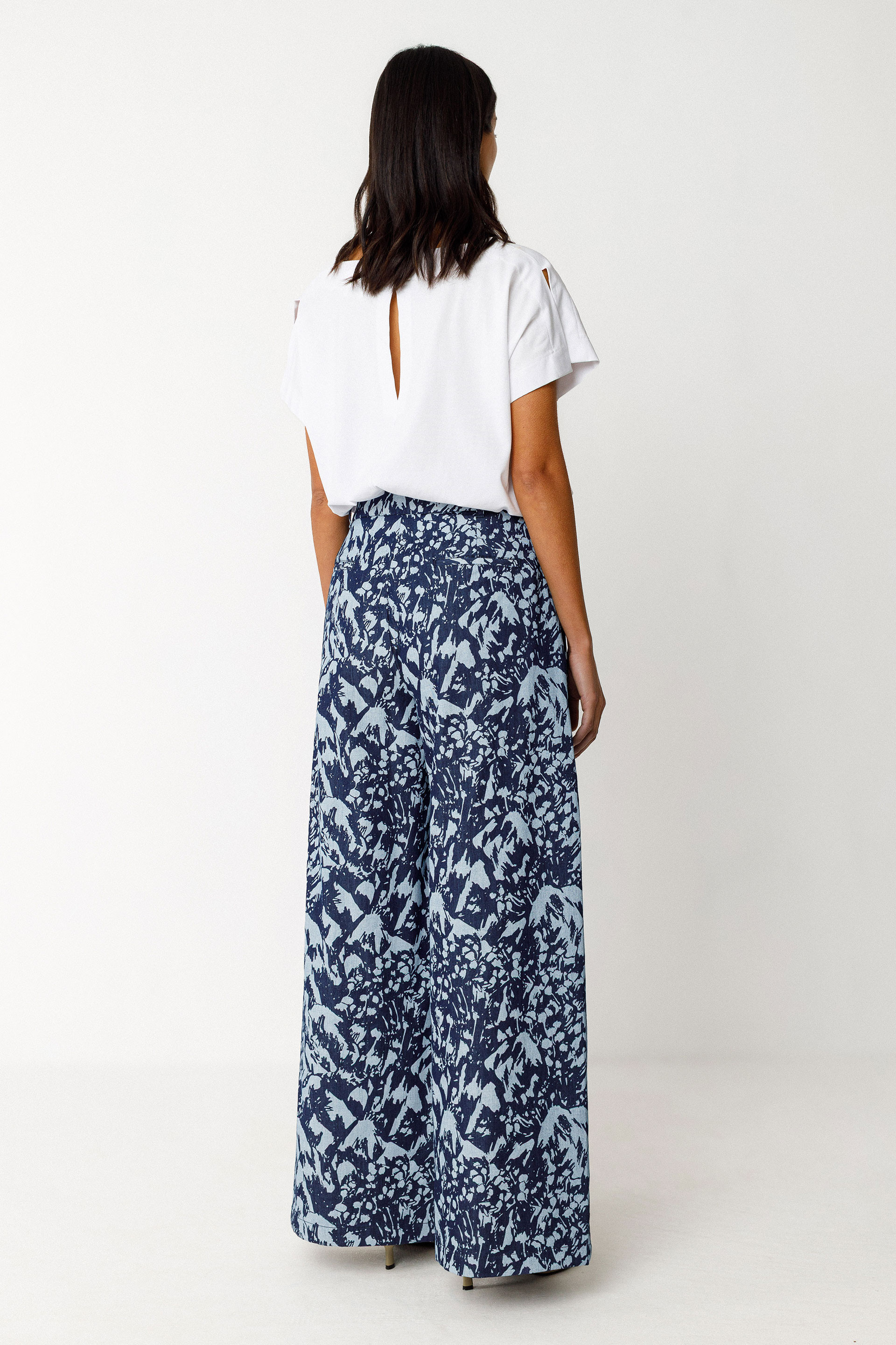 Wide-leg ankle-length trousers with a classic waist. They feature side pockets and a front zip closure. Outseam: 103 cm (size 38).