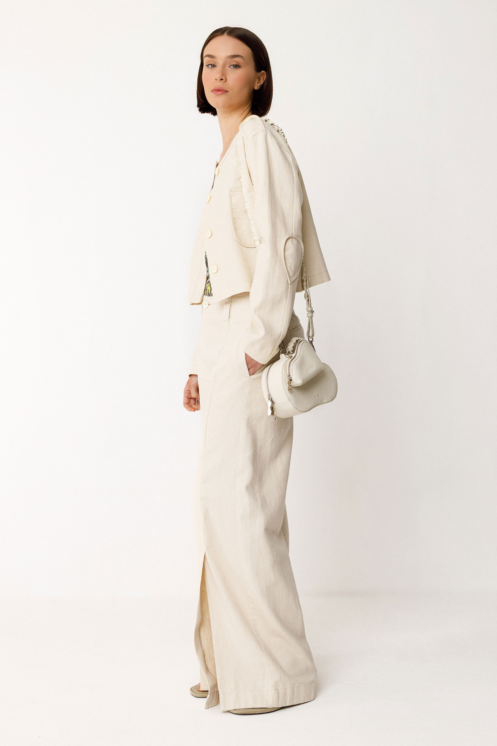 High-waisted palazzo trousers in organic linen-cotton blend. Wide-leg fit with front slits. Zip fly at the front with side pockets. Outseam: 106 cm (size 38)