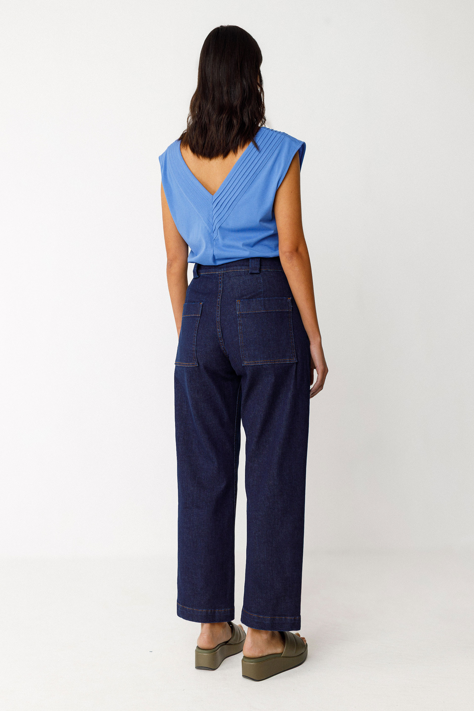 Loose-fitting ankle-length denim trousers. Front zip fly and side pockets. Outseam: 98 cm (size 38).
