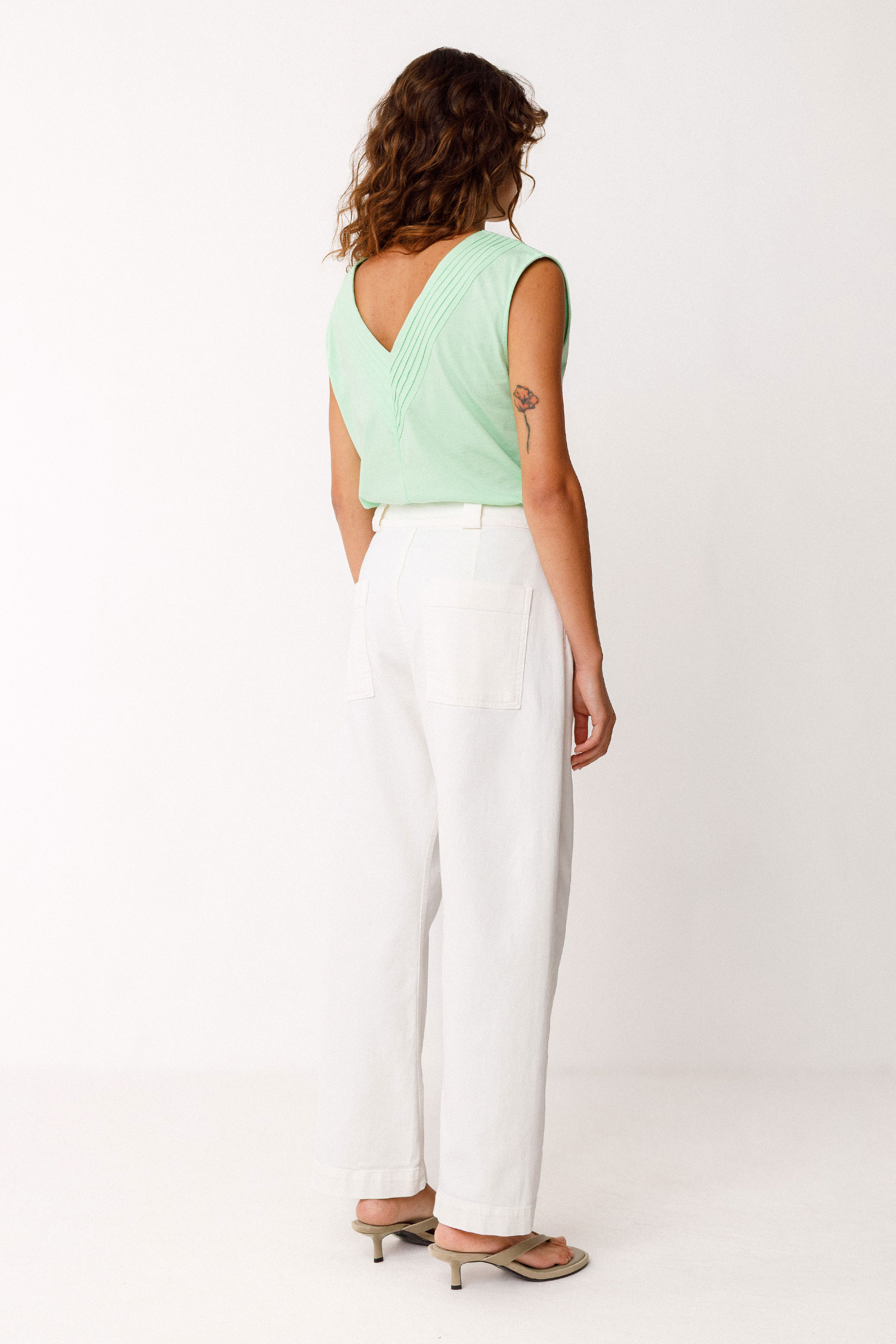 Loose-fitting ankle-length trousers. Front zip fly and side pockets. Outseam: 98 cm (size 38).