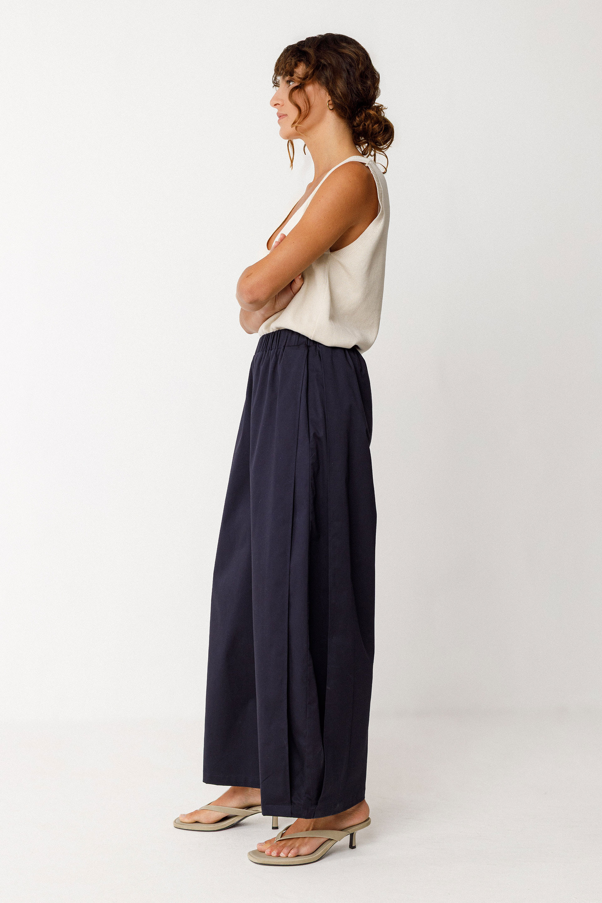 Wide-leg pleated trousers. Cut at the ankles, they feature an elastic waistband and side pockets. Outseam: 95 cm (size 38).
