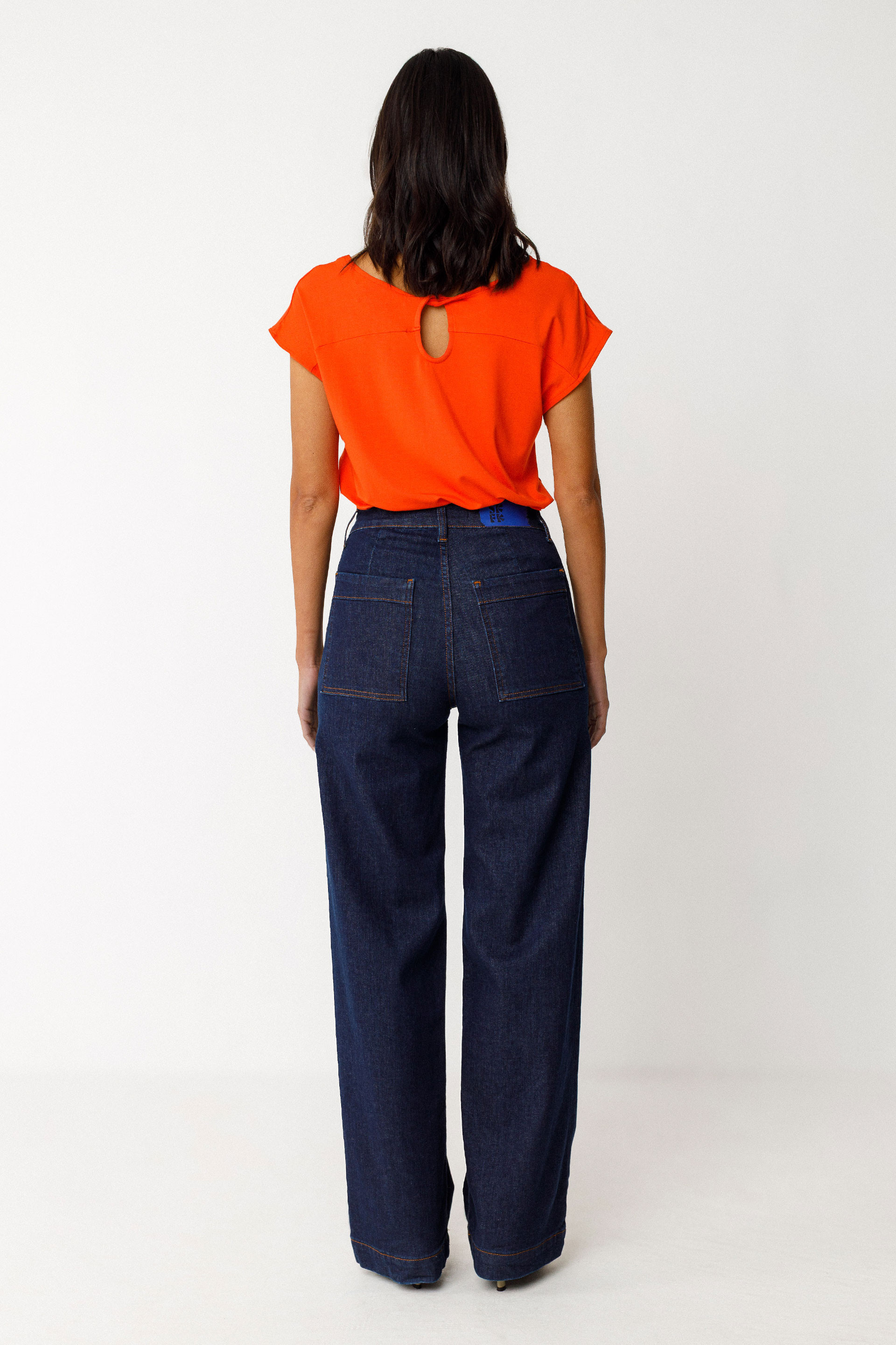 Straight-cut denim trousers with wide legs in a blend of organic cotton and recycled cotton. Front zip closure with front and back pockets. Outseam: 107 cm (size 38).