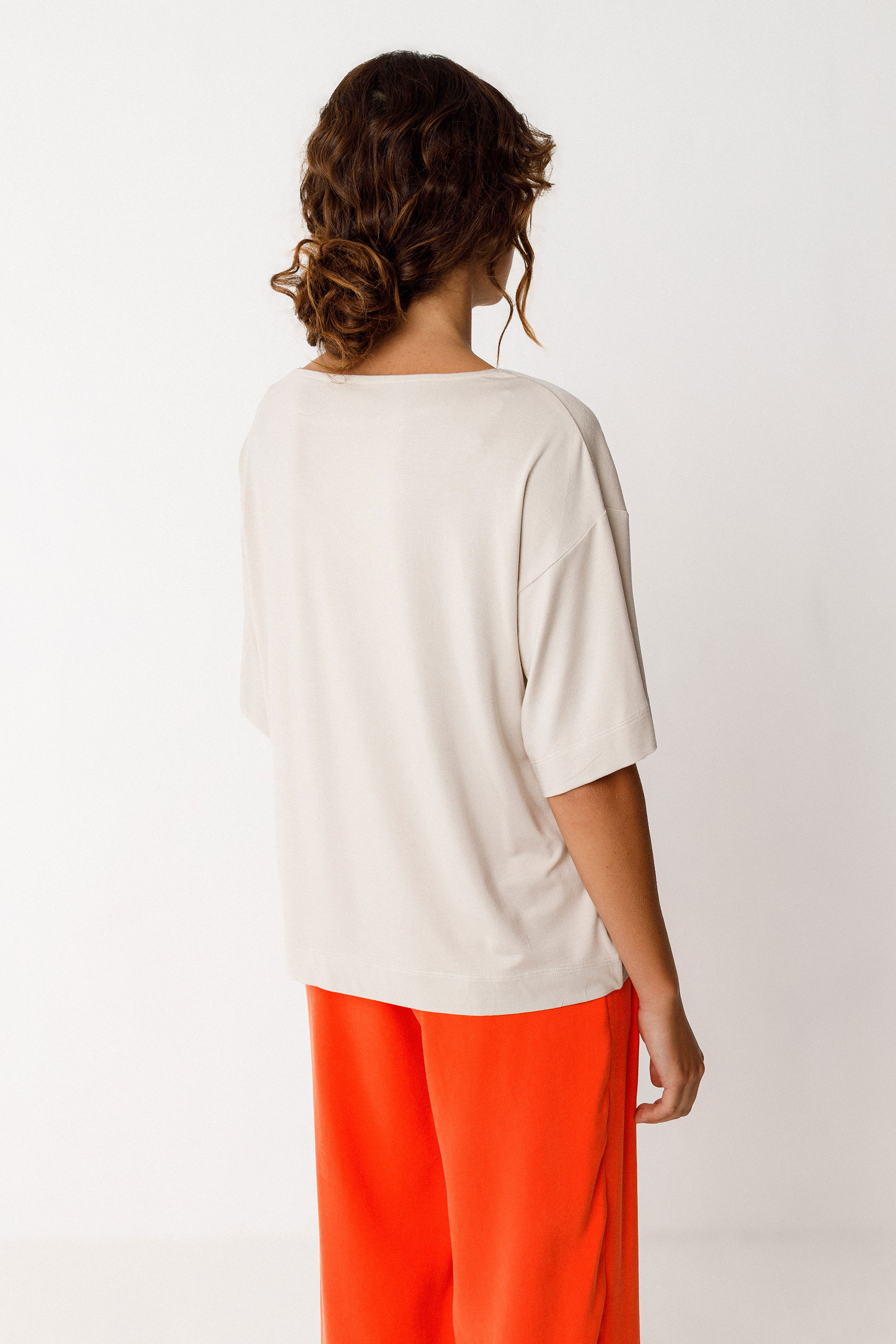 Loose-fitting top with a boat neck and short sleeves, featuring a wrapped effect at the front.