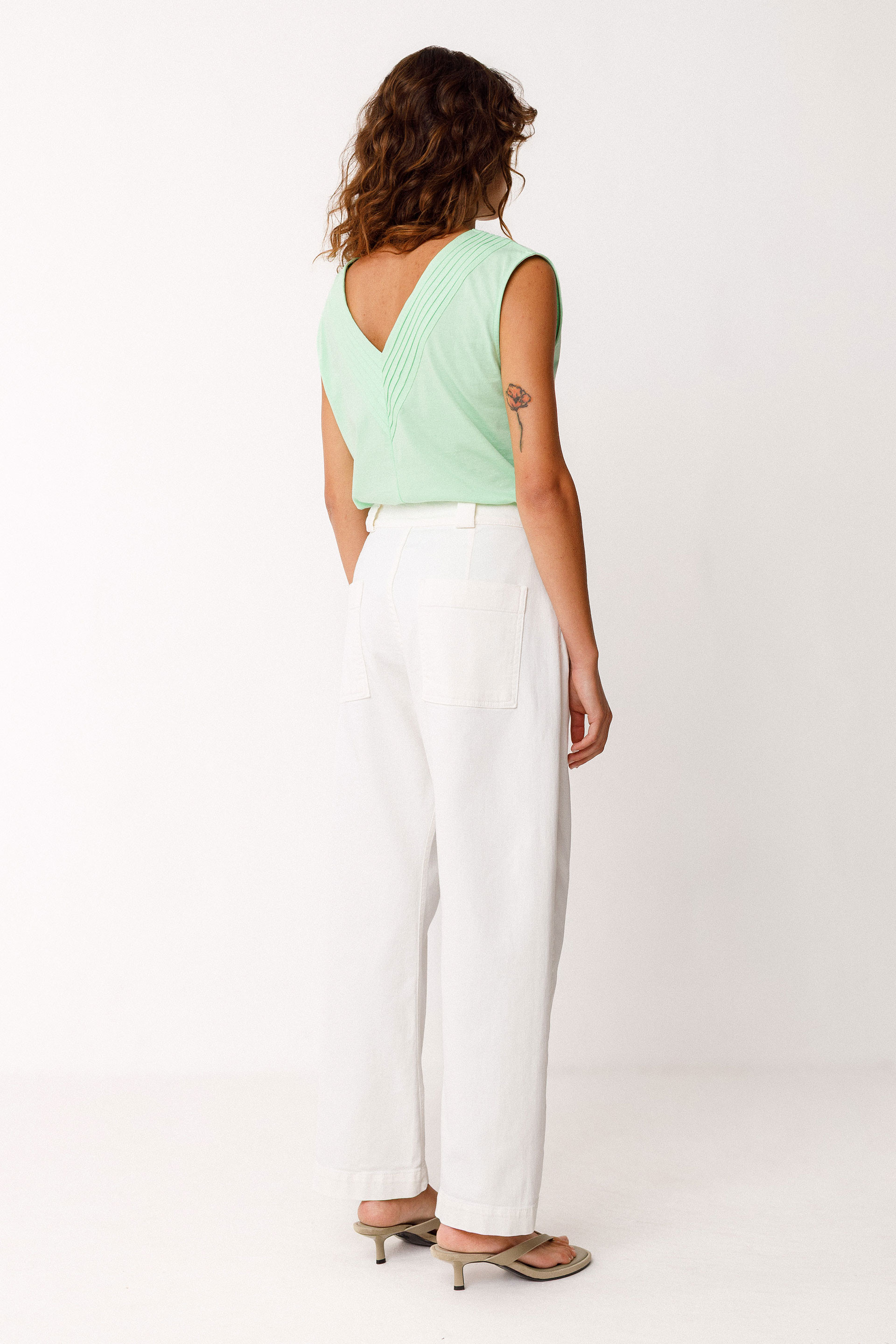 Sleeveless V-neck top in GOTS-certified organic cotton. Straight cut with pin tucks at the neckline.