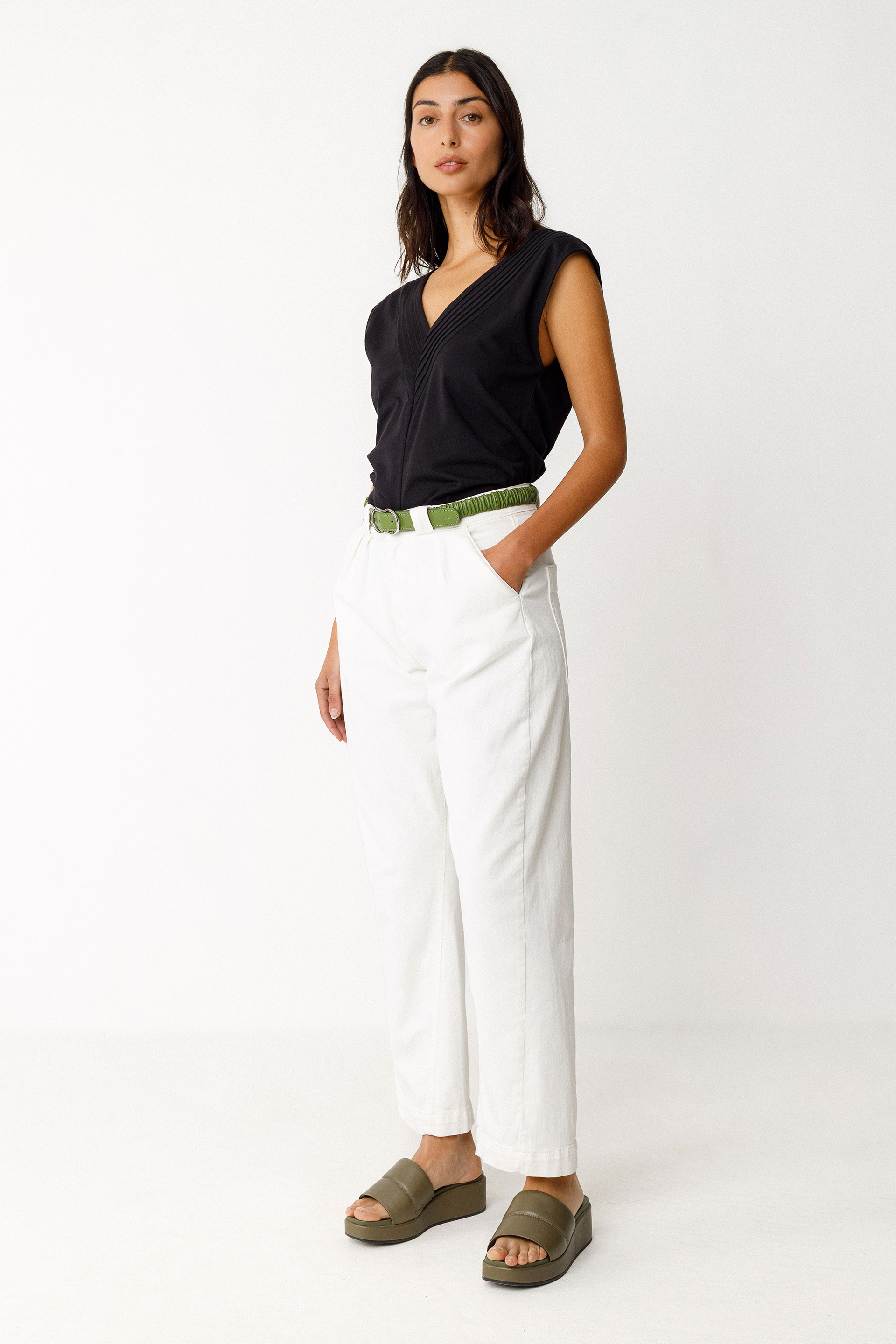 Sleeveless V-neck top in GOTS-certified organic cotton. Straight cut with pin tucks at the neckline.
