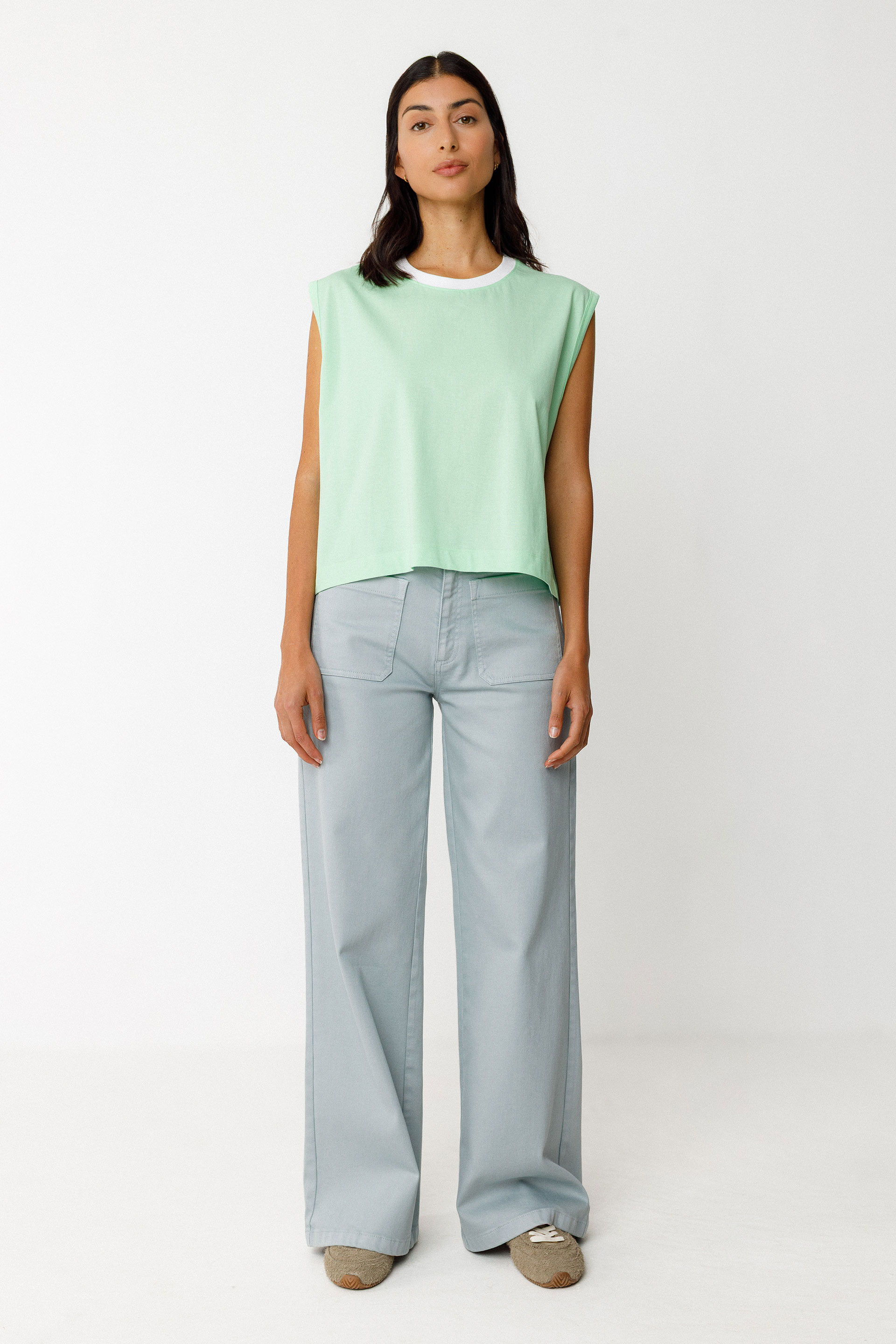 Loose-fitting, sleeveless top with a square cut. It has a round neckline accented with contrasting ribbed trim.