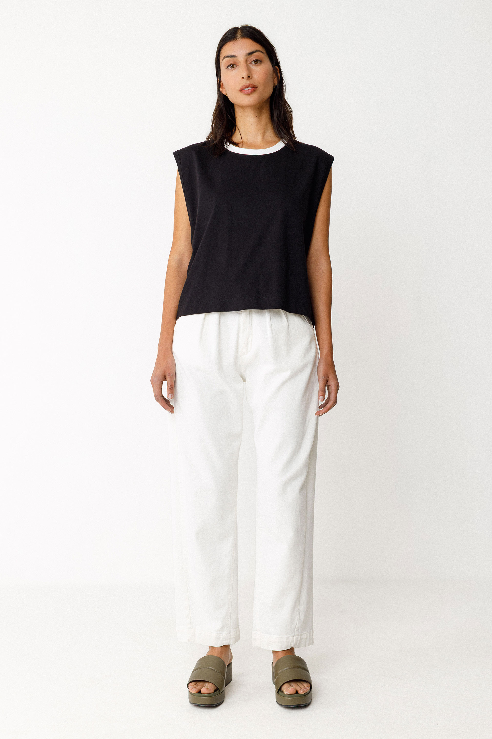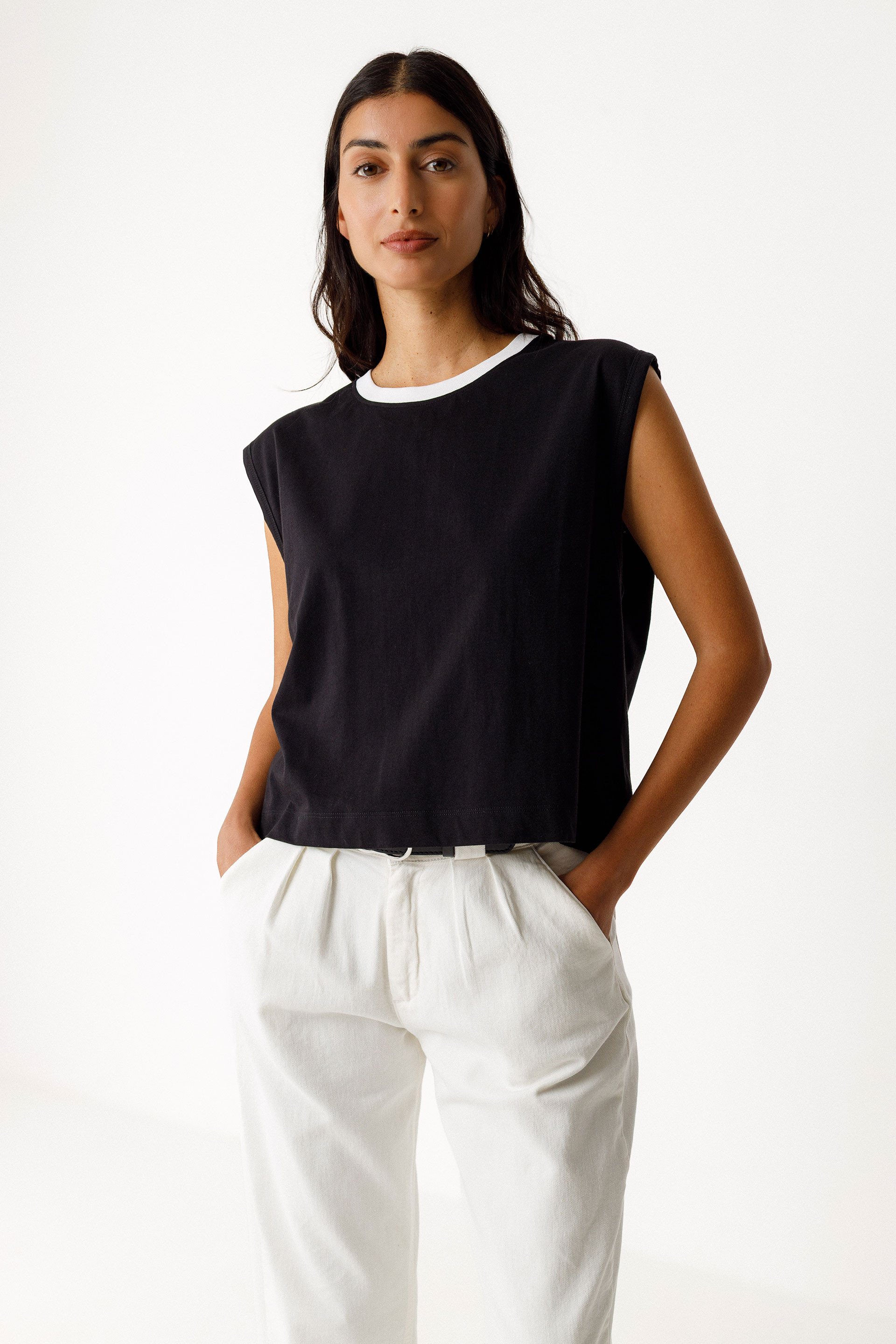 Loose-fitting, sleeveless top with a square cut. It has a round neckline accented with contrasting ribbed trim.
