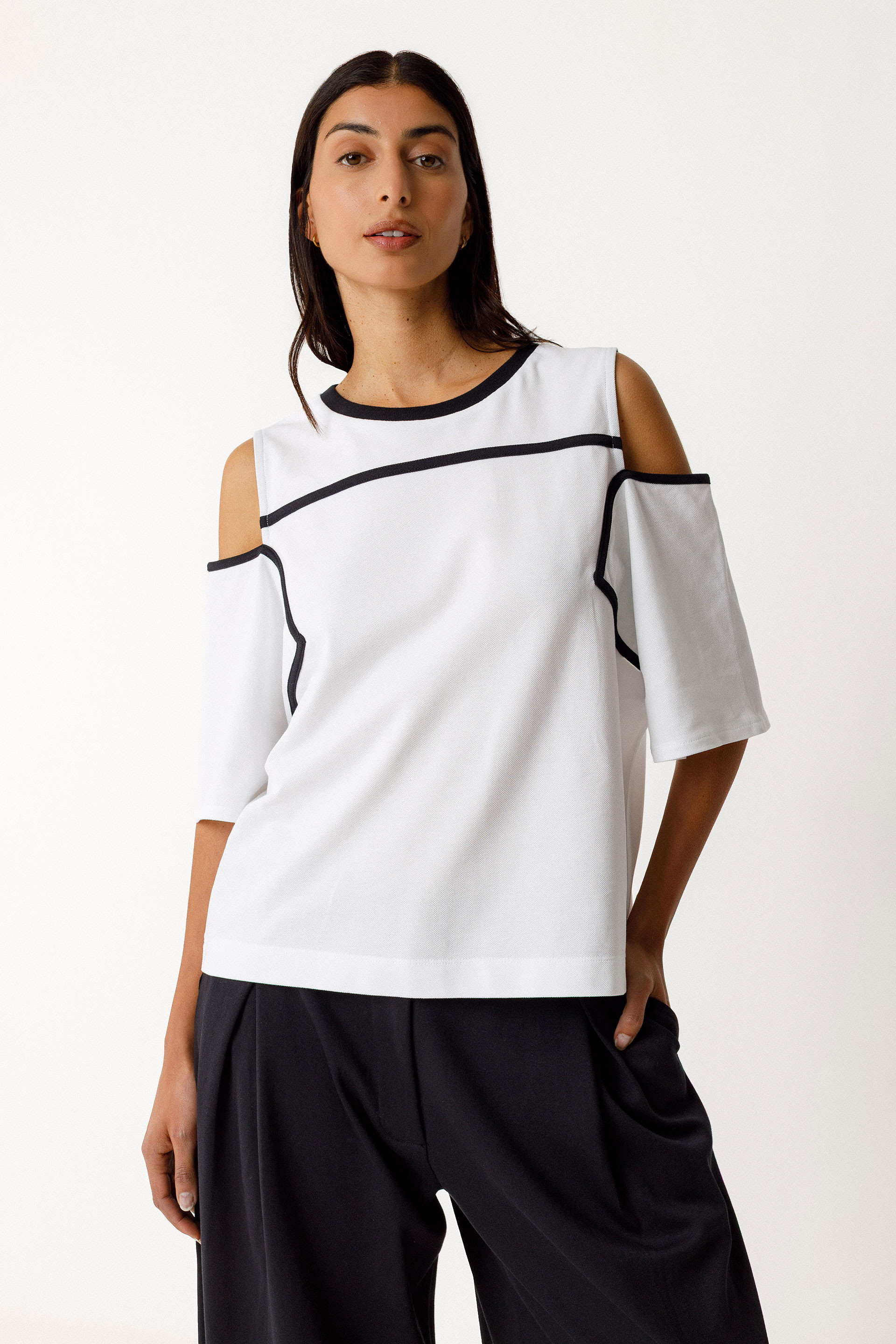Loose-fitting short-sleeved top with a round neckline, cut out shoulders, and contrasting piping at the cut-outs.