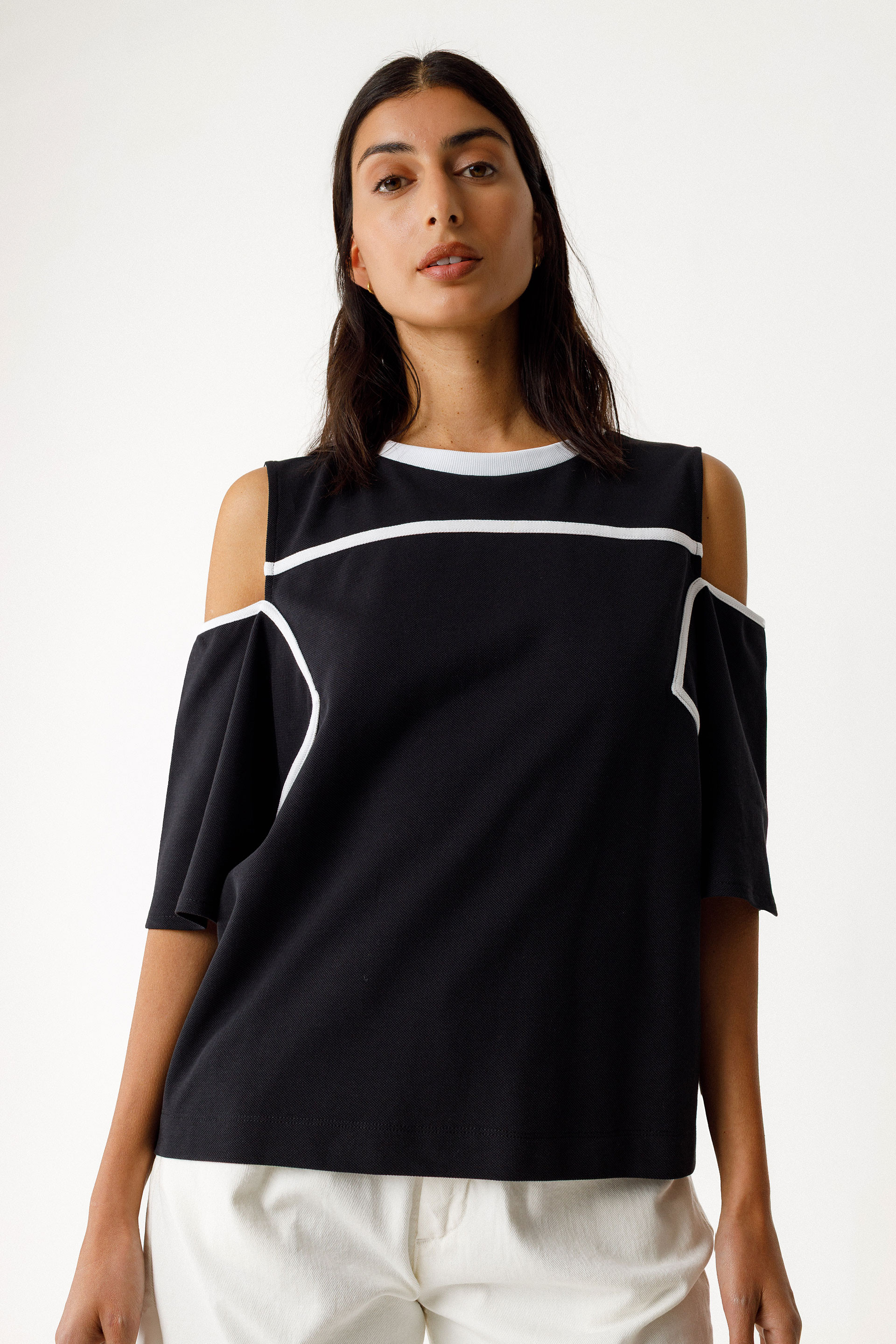 Loose-fitting short-sleeved top with a round neckline, cut out shoulders, and contrasting piping at the cut-outs.