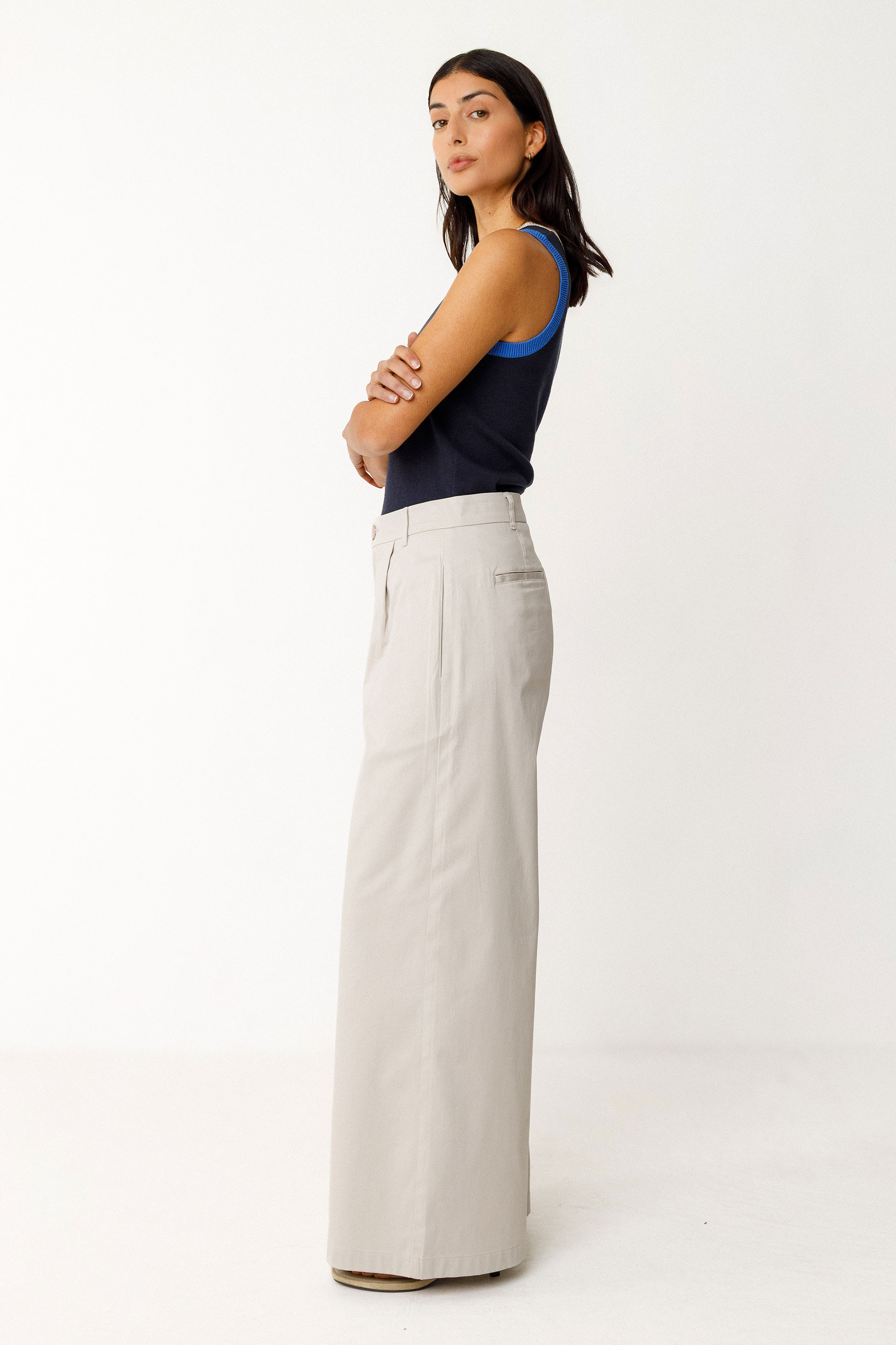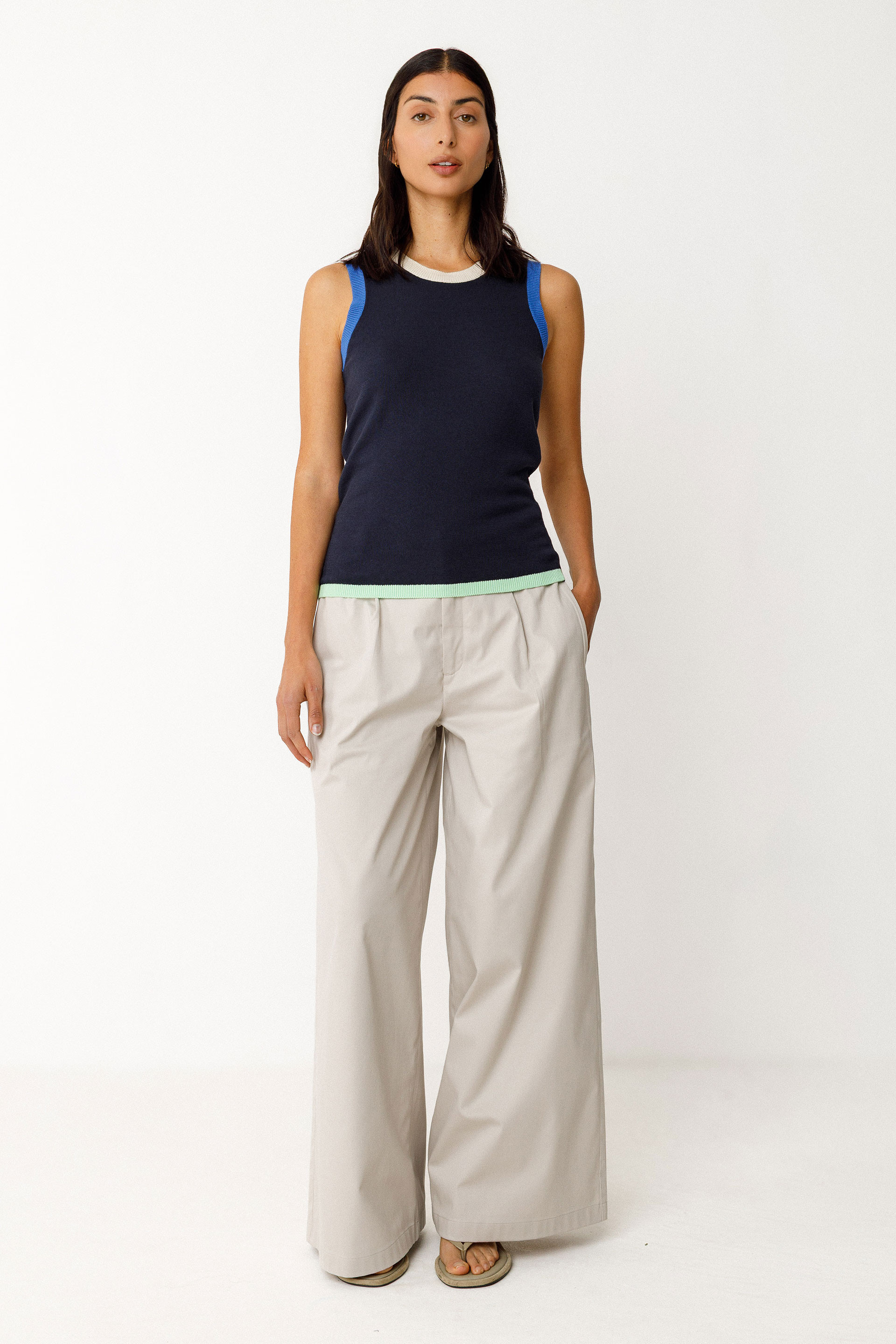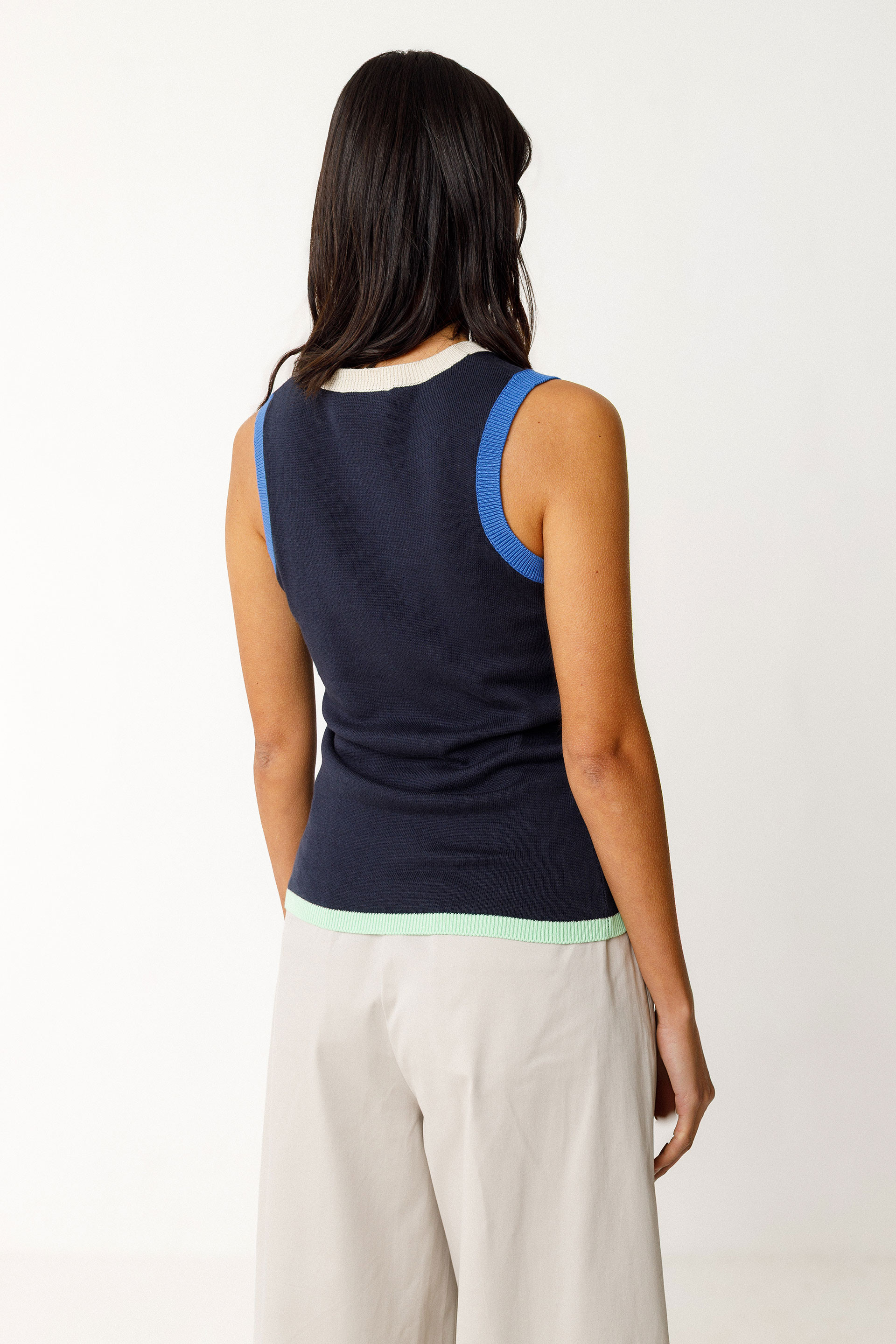 Fitted sleeveless top in a lightweight knit. Round neckline and contrasting ribbed trim at the neck, armholes, and hem.