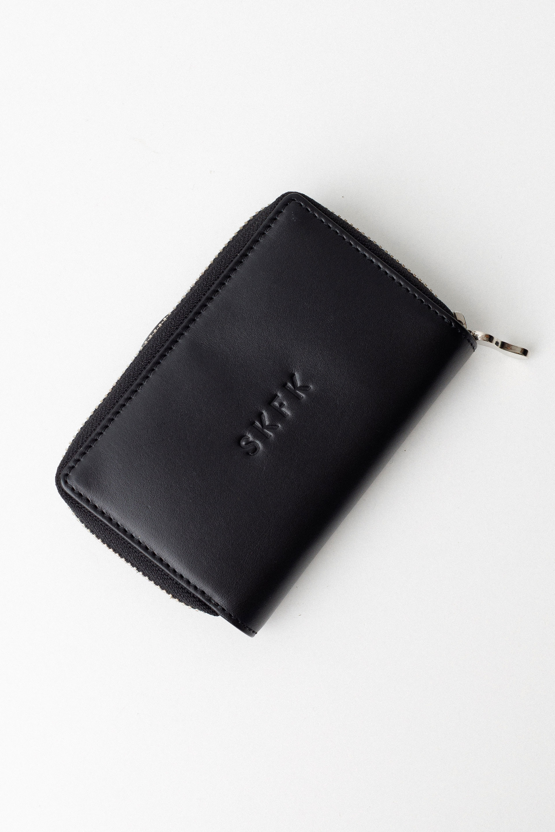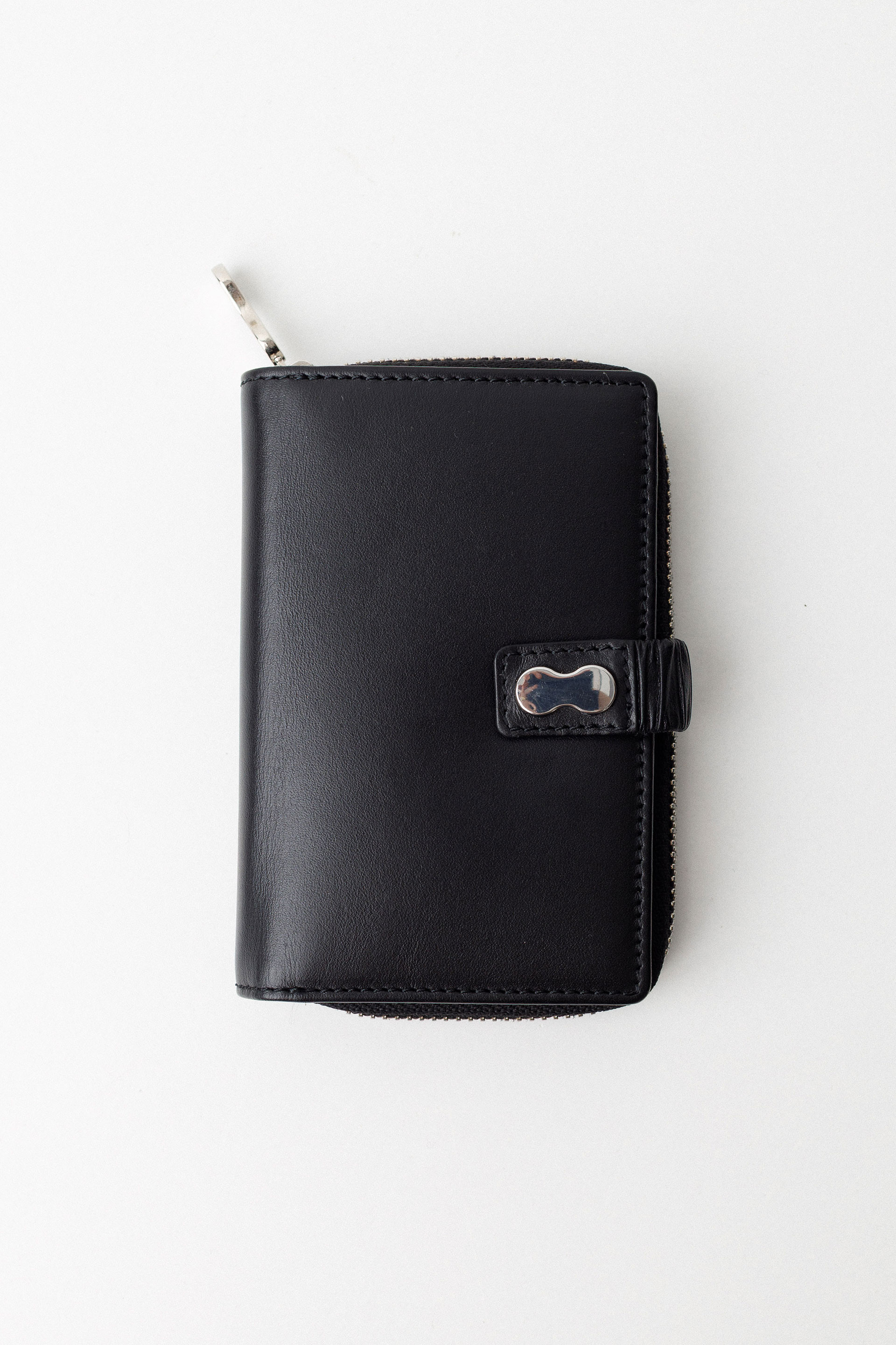 Leather wallet with zip coin pocket. Gathered strap with snap closure over a compartment for cards and bills. Size: 12.5 cm x 9 cm.