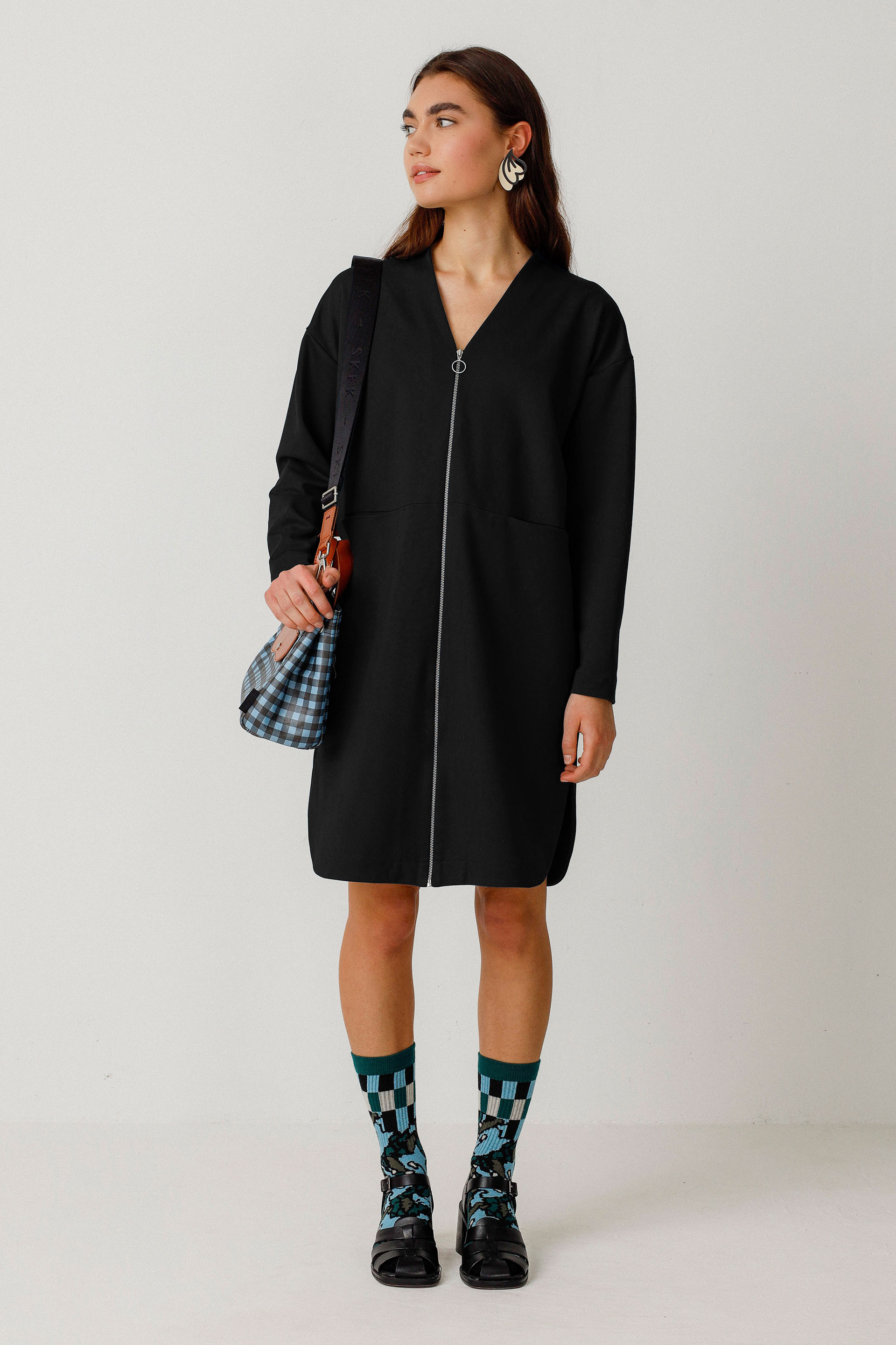 Above-the-knee loose-fitting dress with a V-neck, long sleeves, front pockets, and front double slider zip closure. It also features rounded side slits at the bottom.