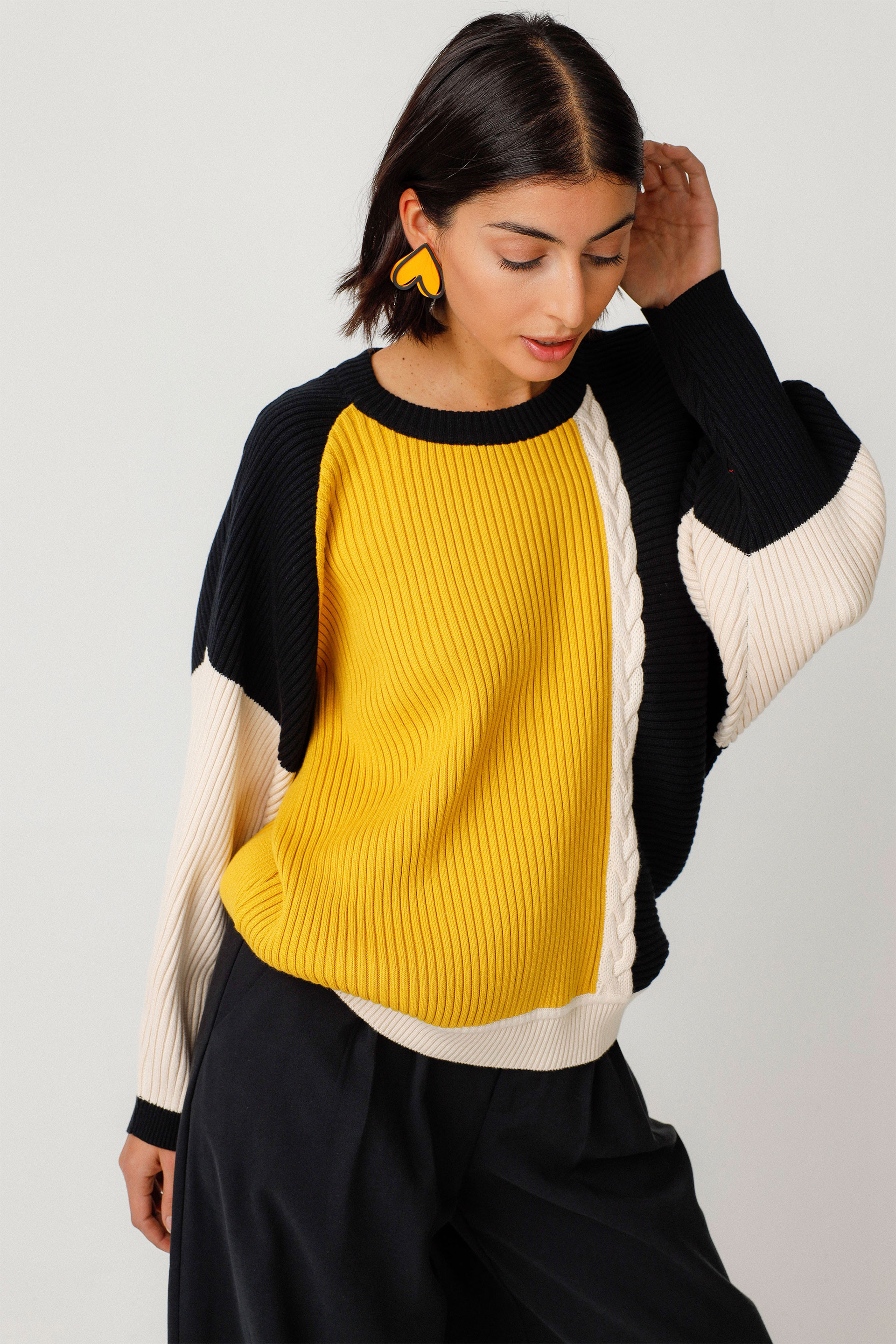 Loose fit multicolour tricot sweater with a round neck, batwing sleeves, and mid-weight construction. Loose and comfortable fit with a touch of colour. GOTS certified organic cotton.