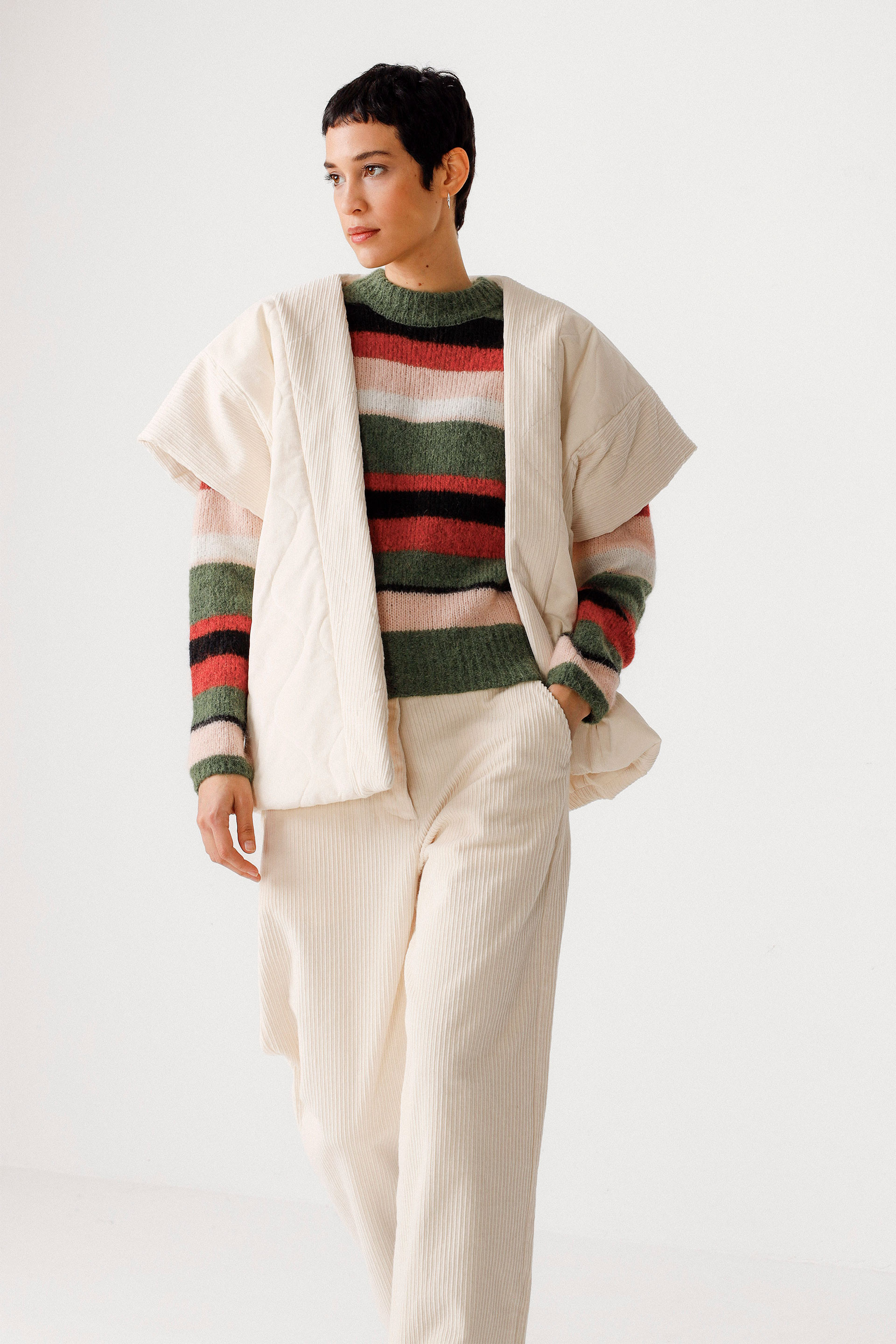 Premium knit sweater with a short round neck and long sleeves, crafted from recycled materials with a fuzzy finish, it is made in Portugal. Embraces a luxurious feel with an eco-friendly design.