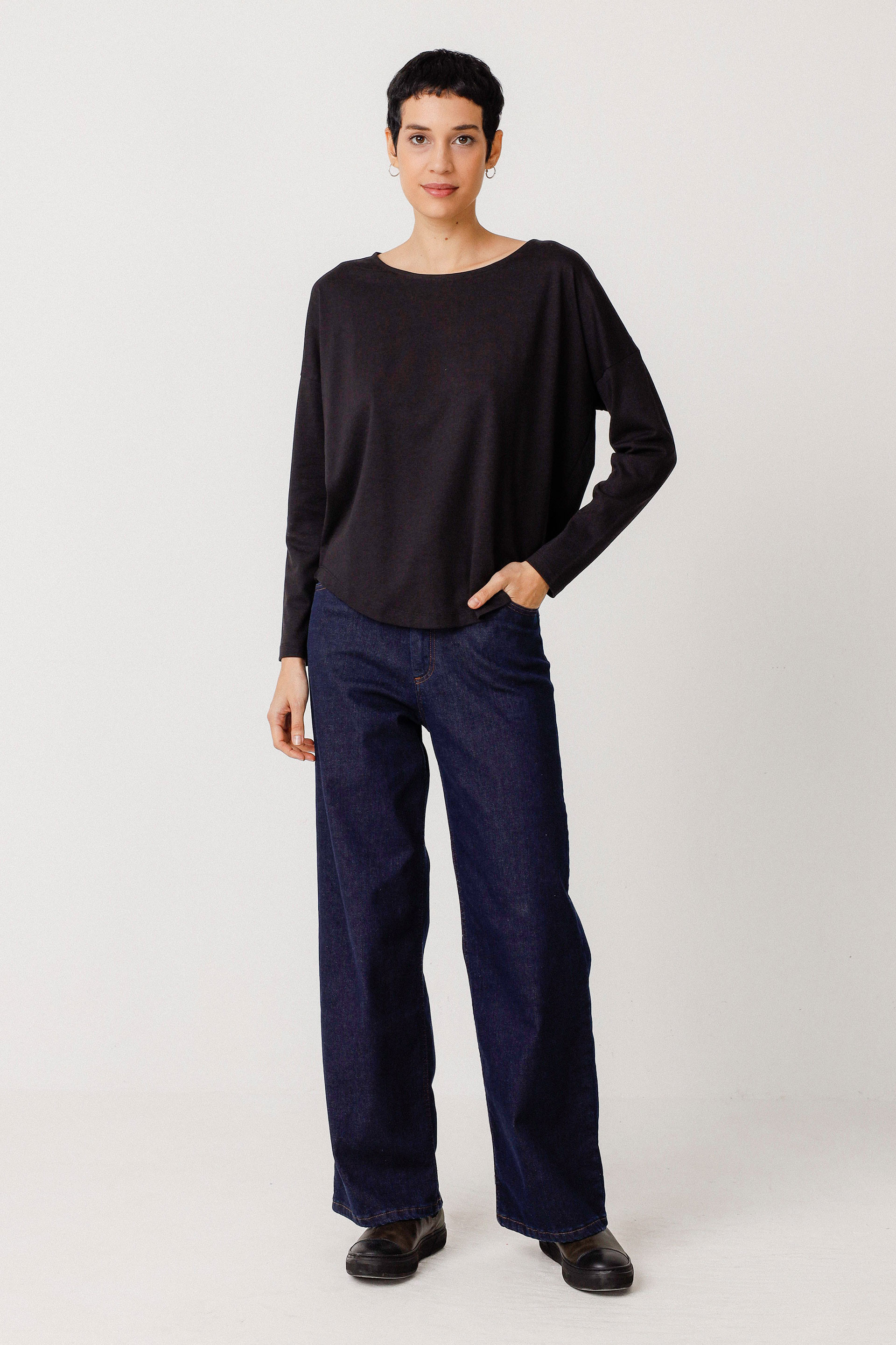 Loose fit top with a boat neck and long sleeves. A comfortable and relaxed option for everyday wear.