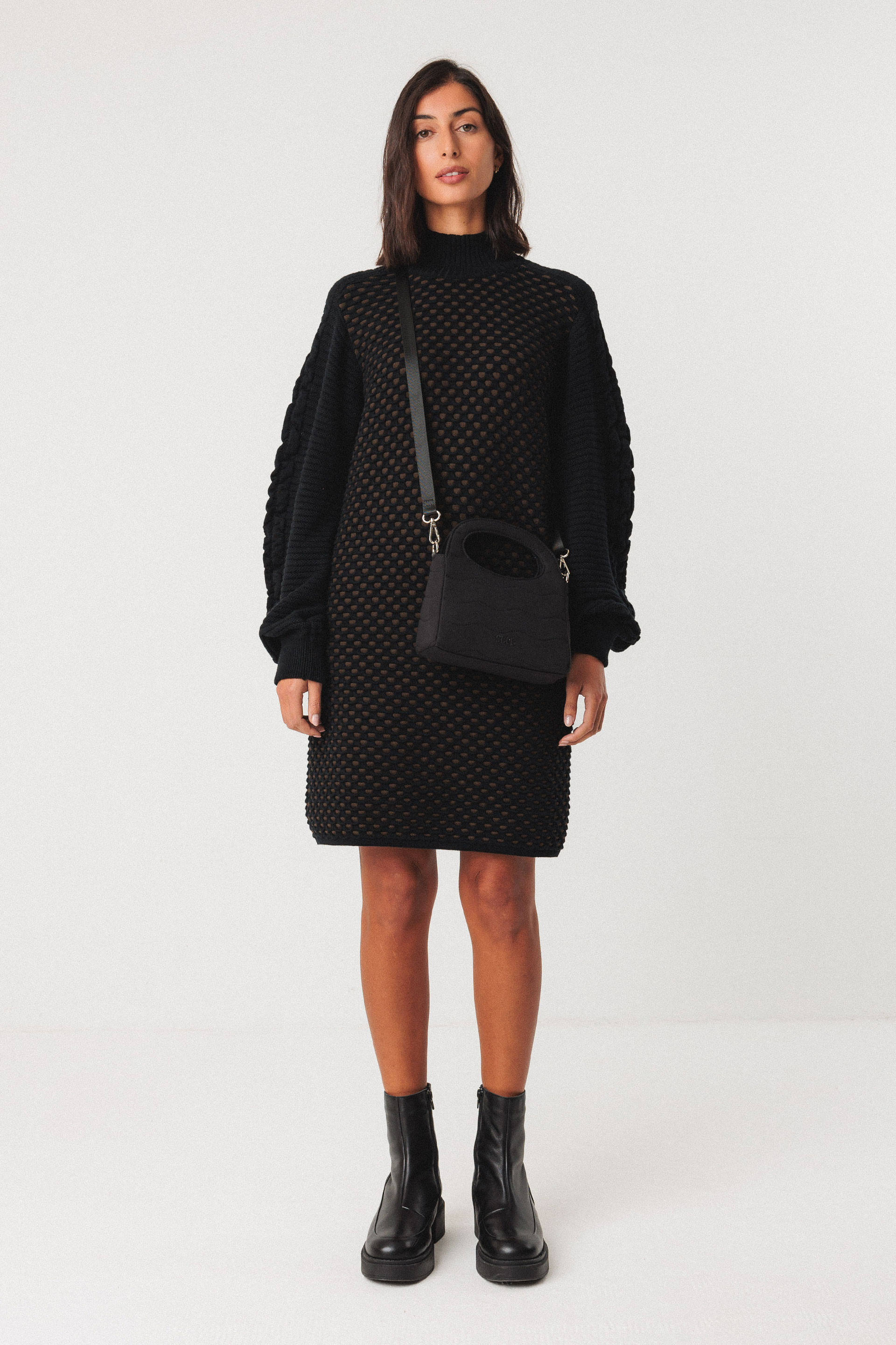 Small square crossbody bag to be carried over the shoulder or by its handle. Magnetic closure and inside pocket. Size: 20 cm x 21 cm x 8 cm.