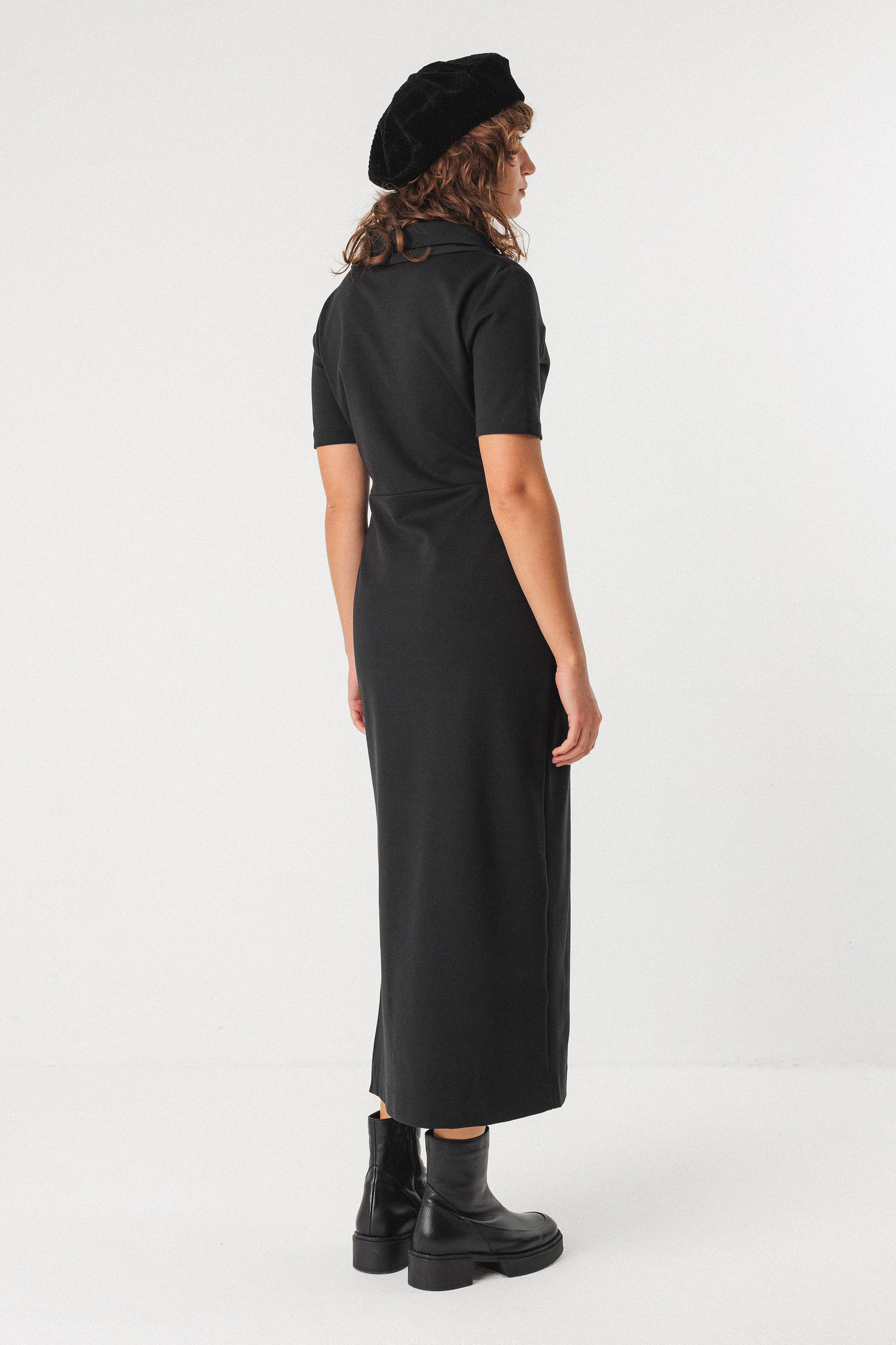 Straight cut ankle length dress in stretch fabric. It has a wrap V-neckline, short sleeves and a zip at the side.