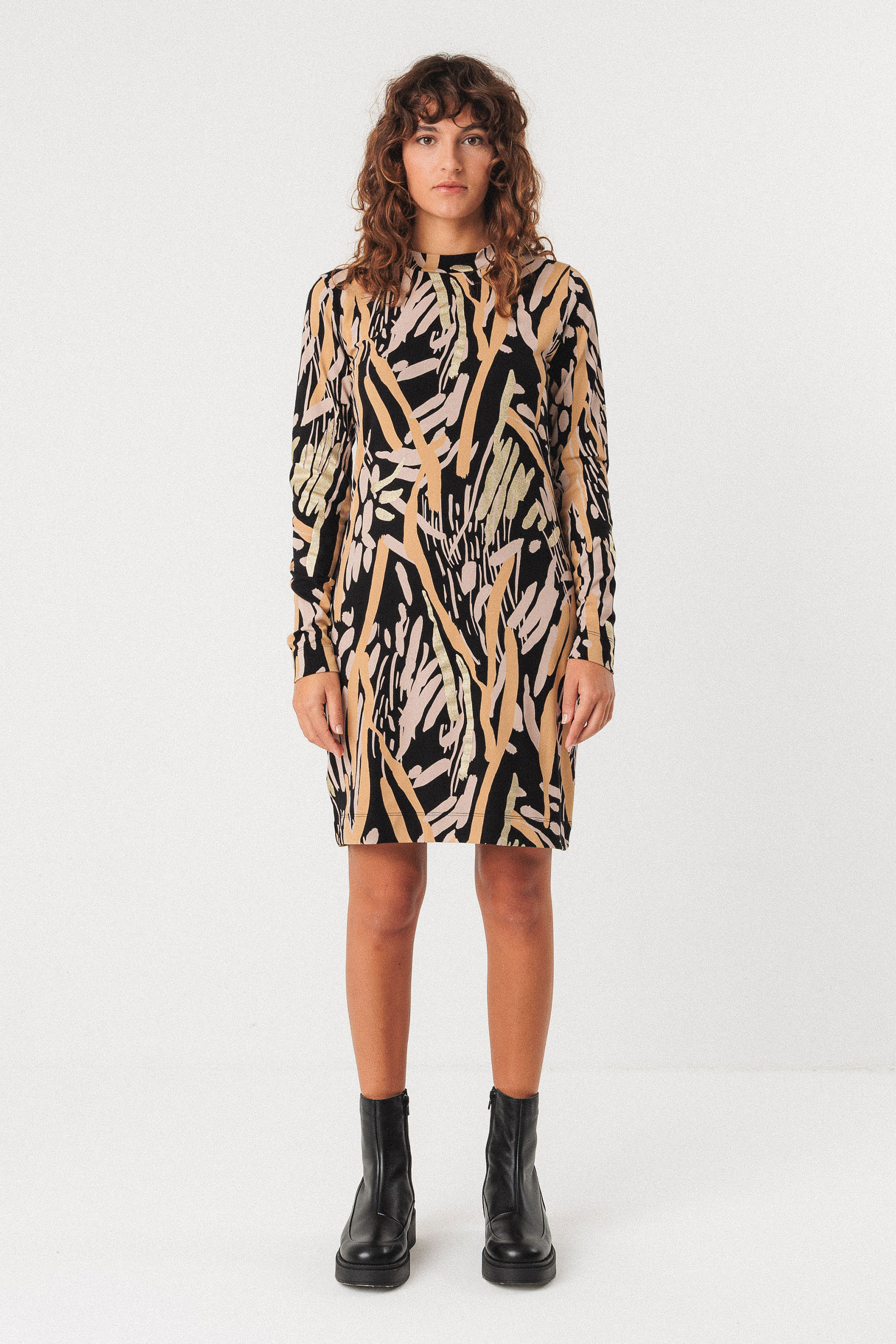 Fitted short dress in stretch organic cotton, with a stand-up collar and long sleeves. Easy to slip on.