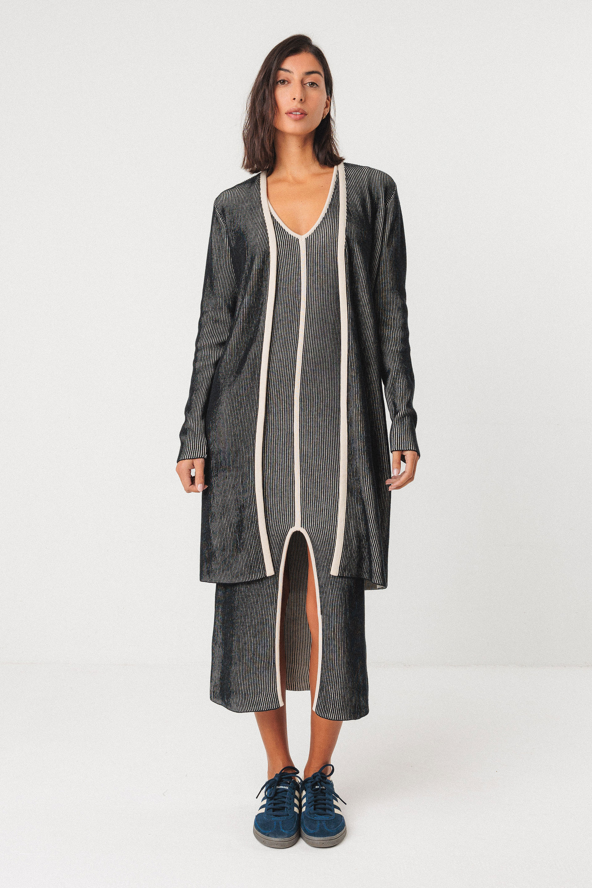 Two-tone midi dress in medium weight ribbed knit. Sleeveless with a deep V-neckline.