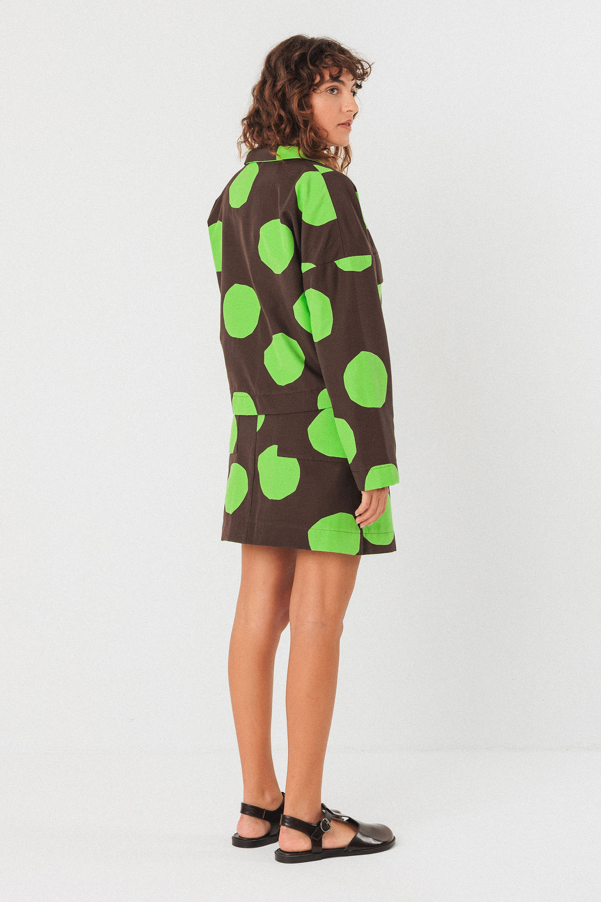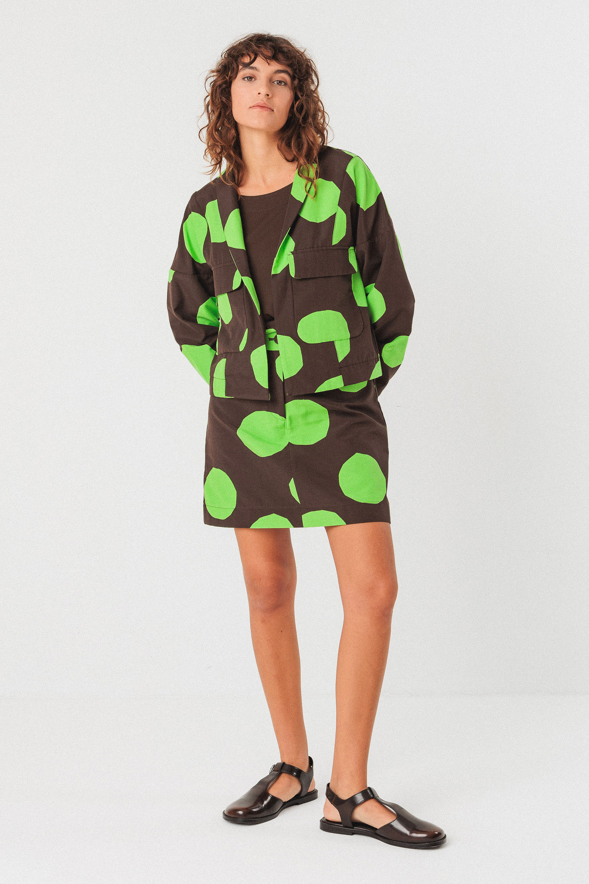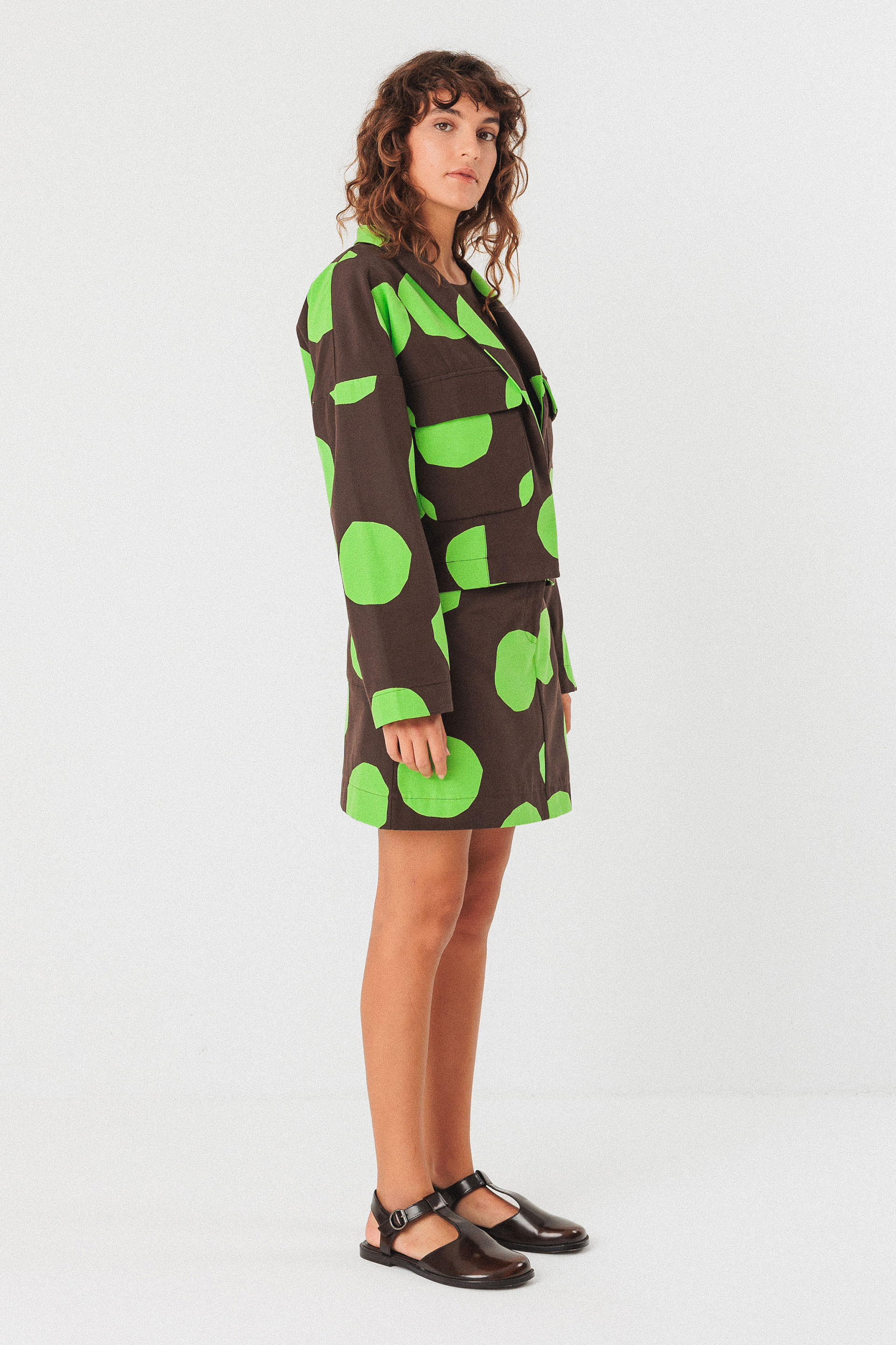 Short jacquard jacket. It has dropped shoulders, patch pockets with flaps and a concealed button closure.