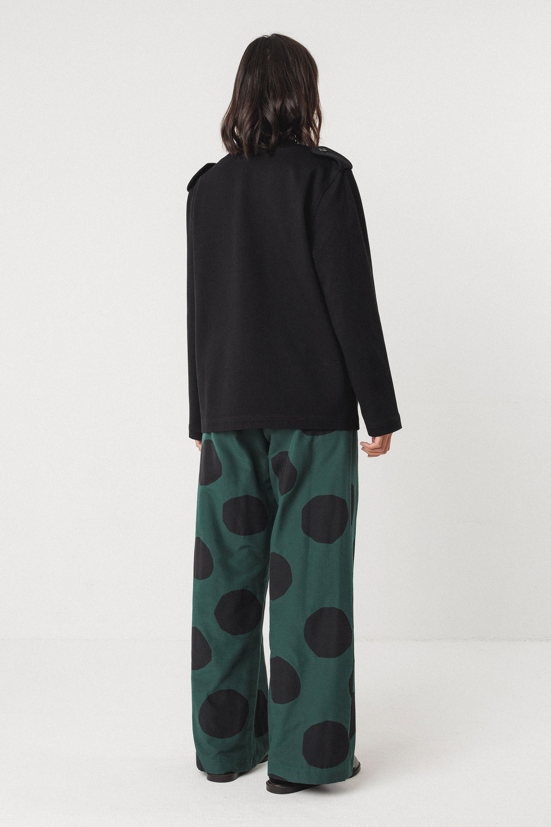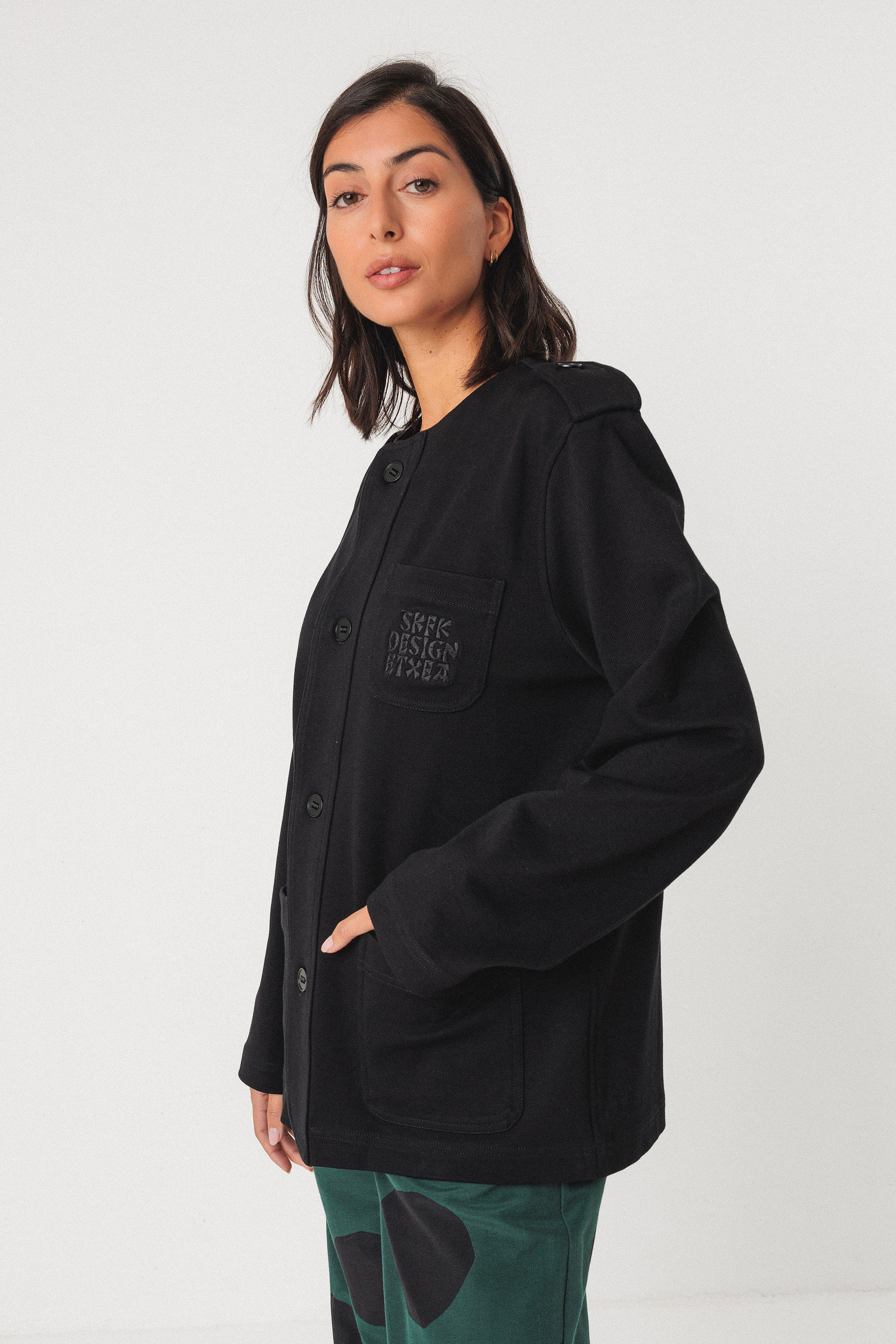 Short jacket with long sleeves, front button closure, round collar and patch pockets.