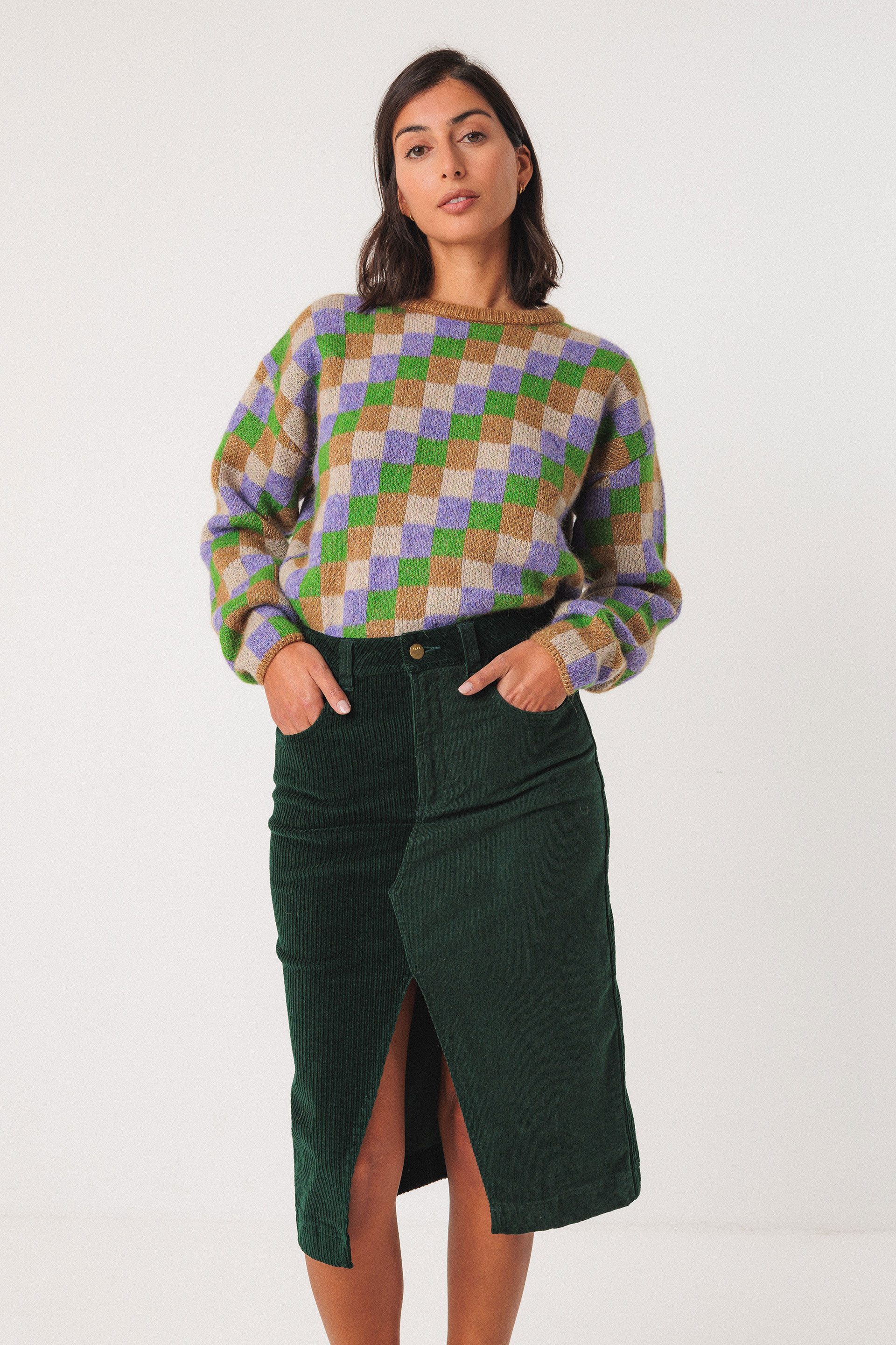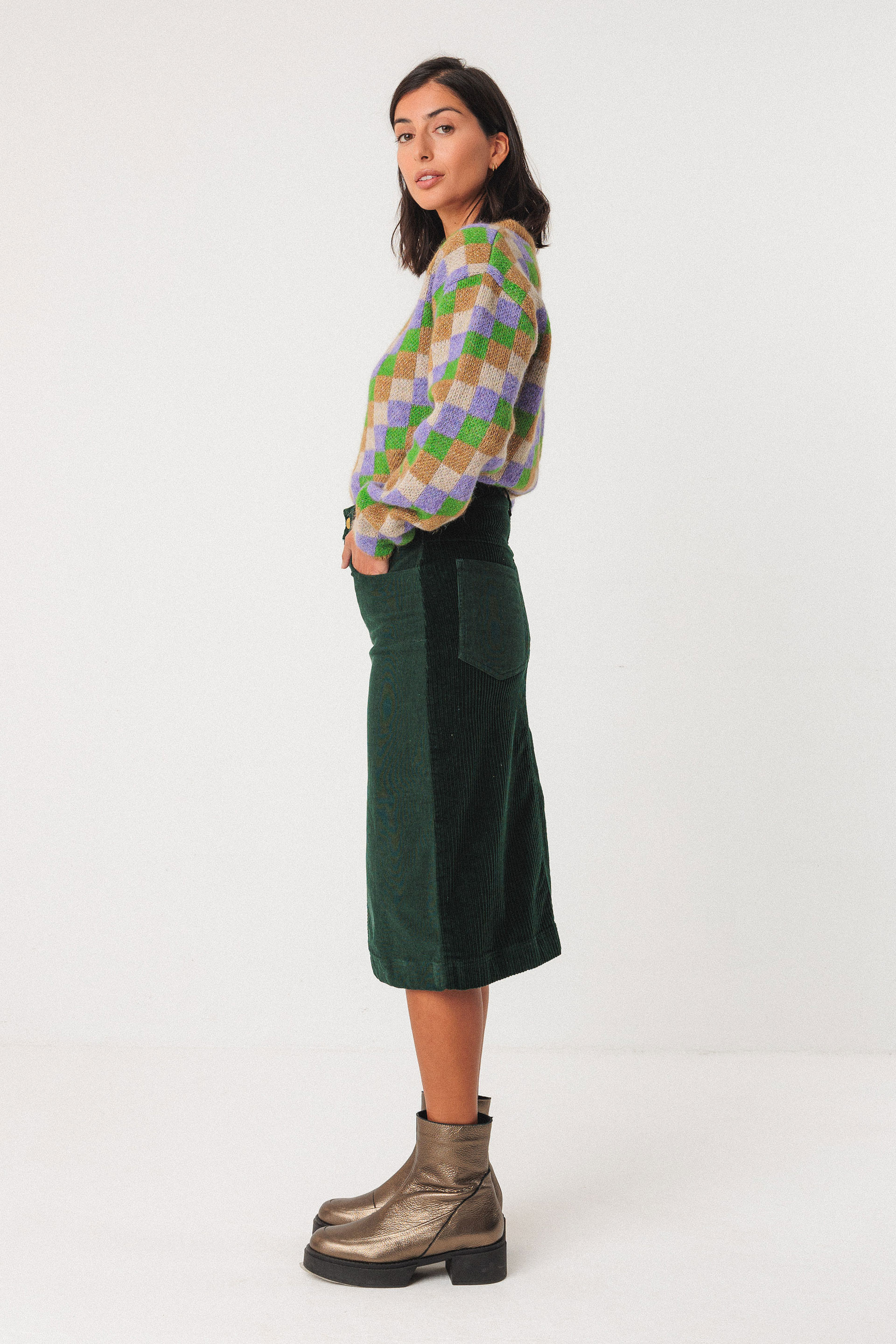 Straight midi skirt combining thin and heavier corduroy fabrics. Button and zip fastening at front.