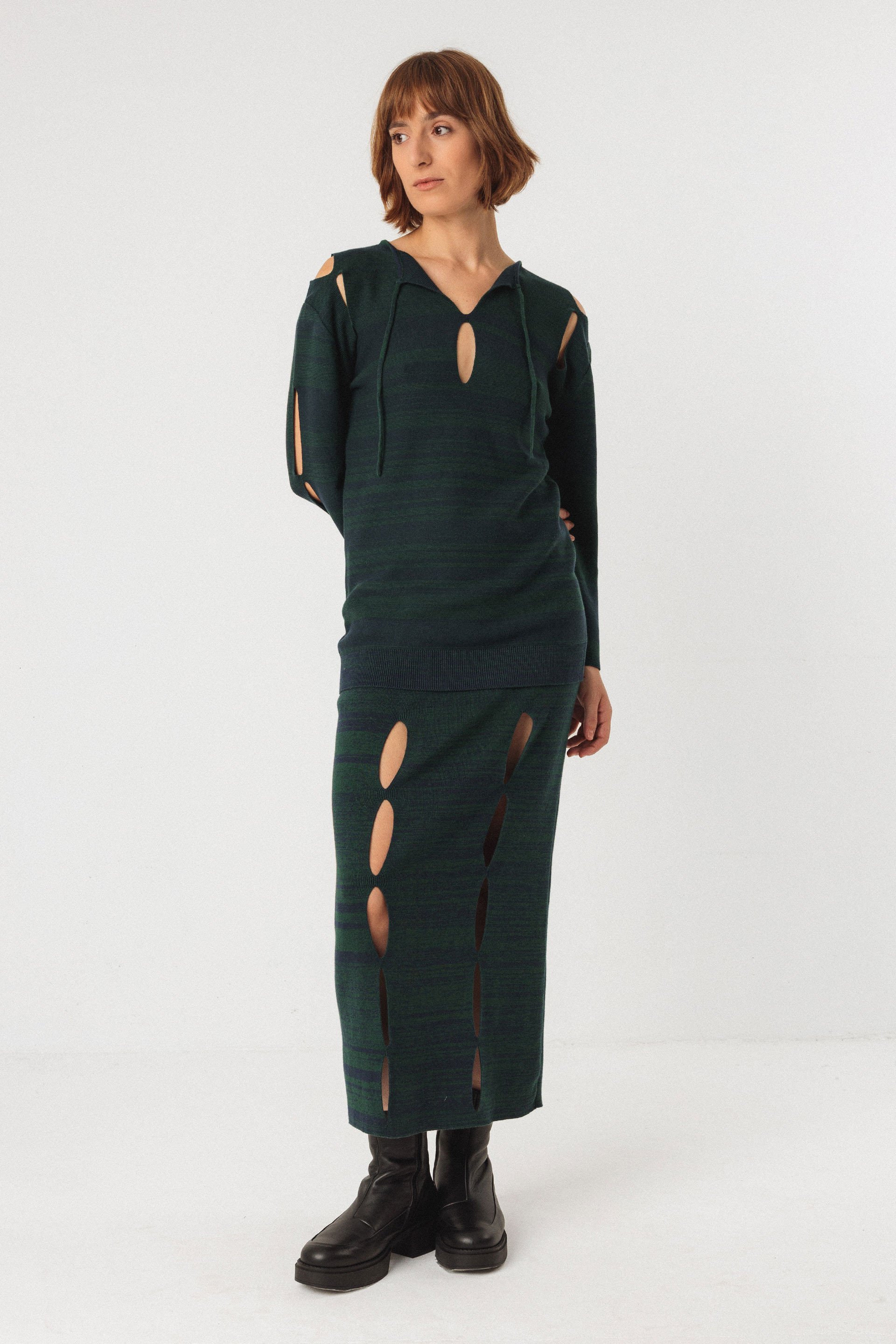 Mid-length knitted skirt with decorative cut-outs, created in collaboration with designer Martina Spetlova. The elasticised waist has buttons to detach the outer skirt.