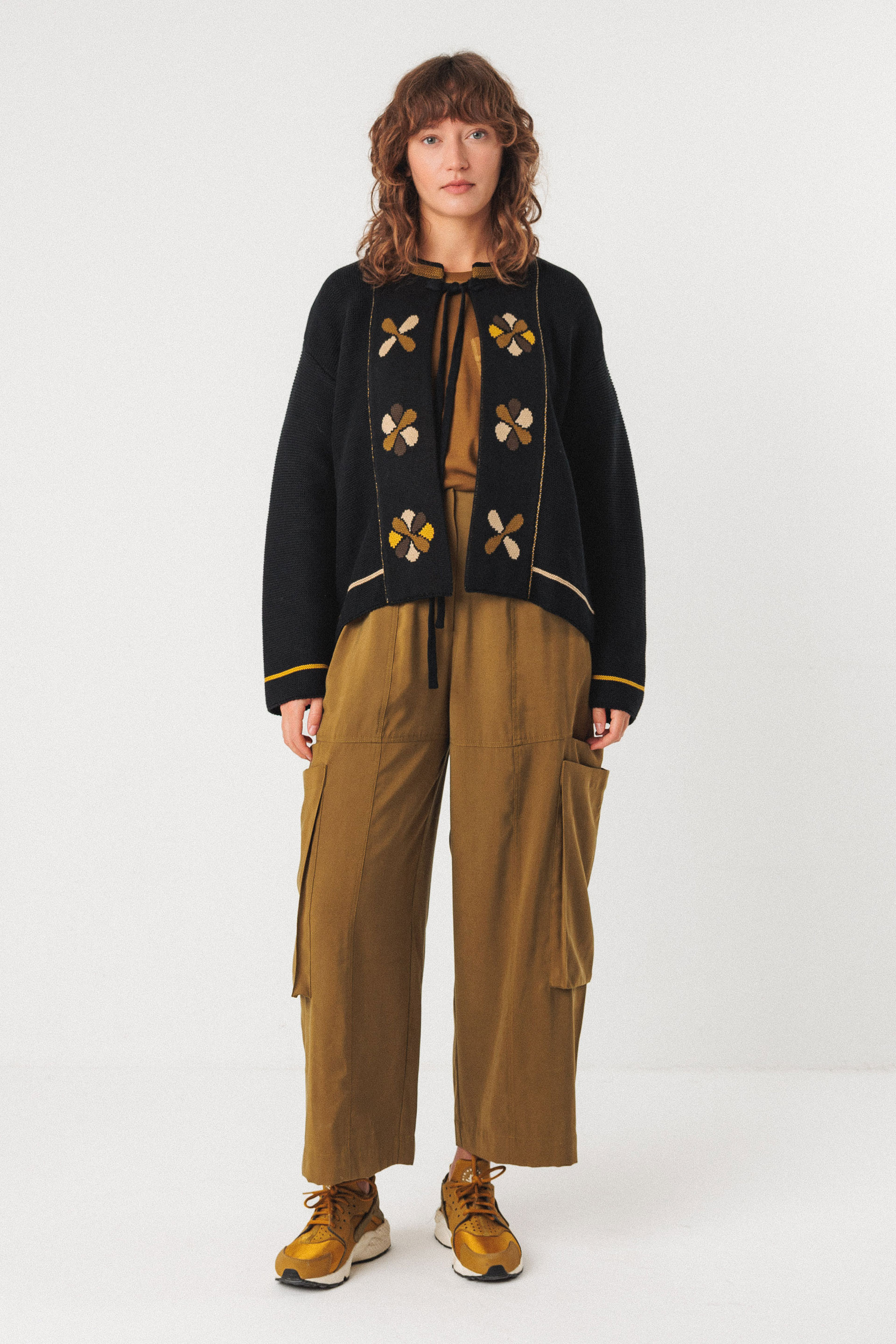 Heavyweight knit cardigan inspired by traditional Basque mendigoizal jackets. Closes with knotted laces.