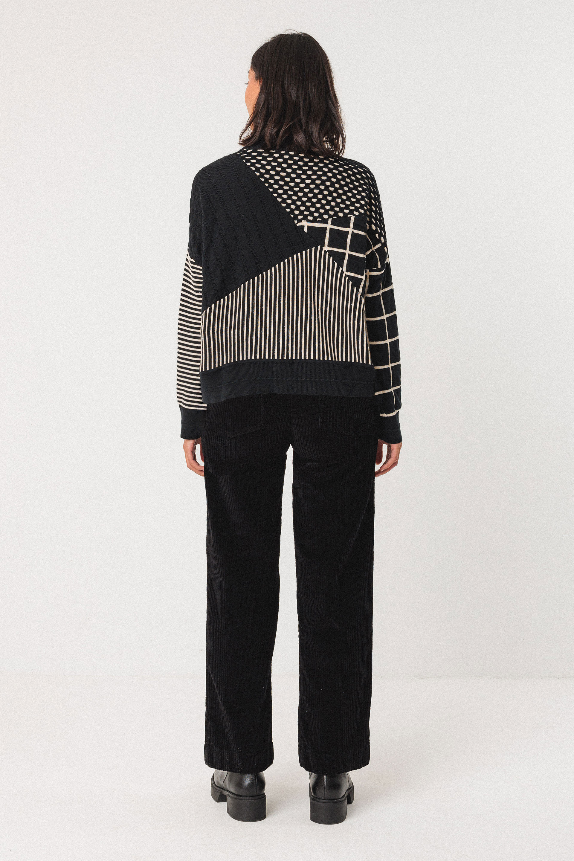 Midweight jacquard sweater with a round neck. It has long sleeves and ribbed trim at the collar, hem and cuffs.