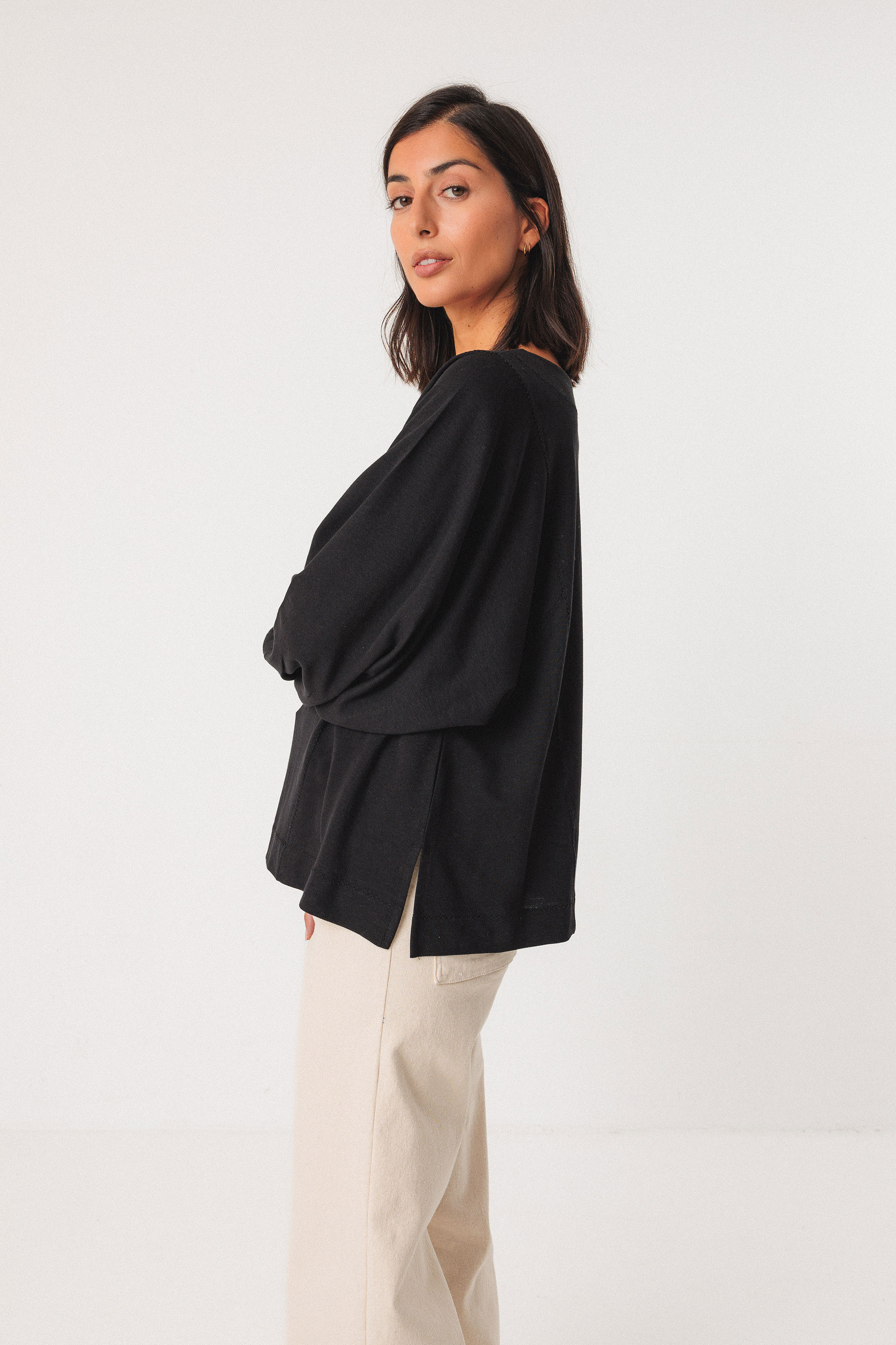 Loose-fitting top with a round neckline and batwing sleeves. Pleated cuffs and side slits.