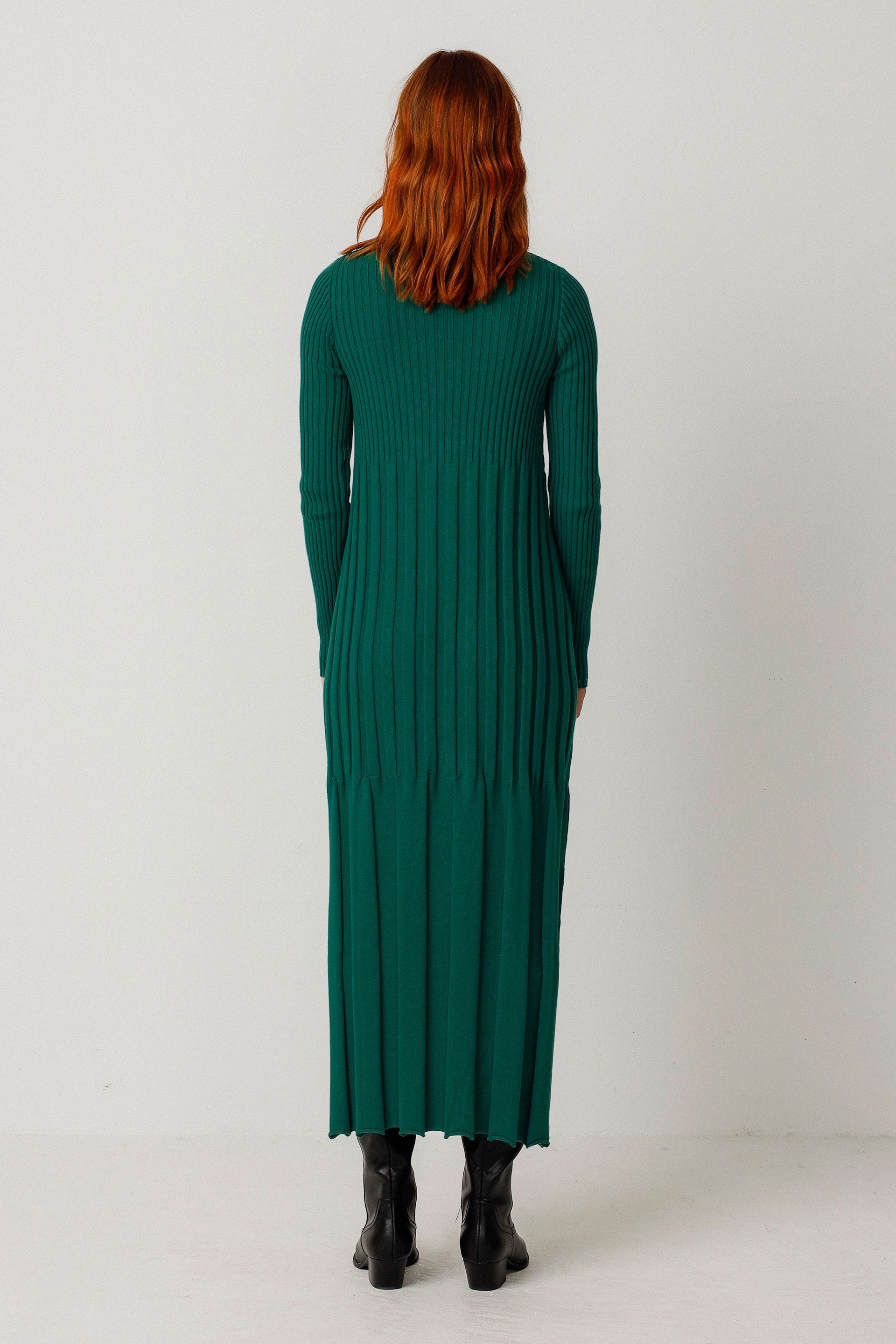 Long A-line knit dress with ribbed knit panels. Medium weight knit with a round neckline and long sleeves.