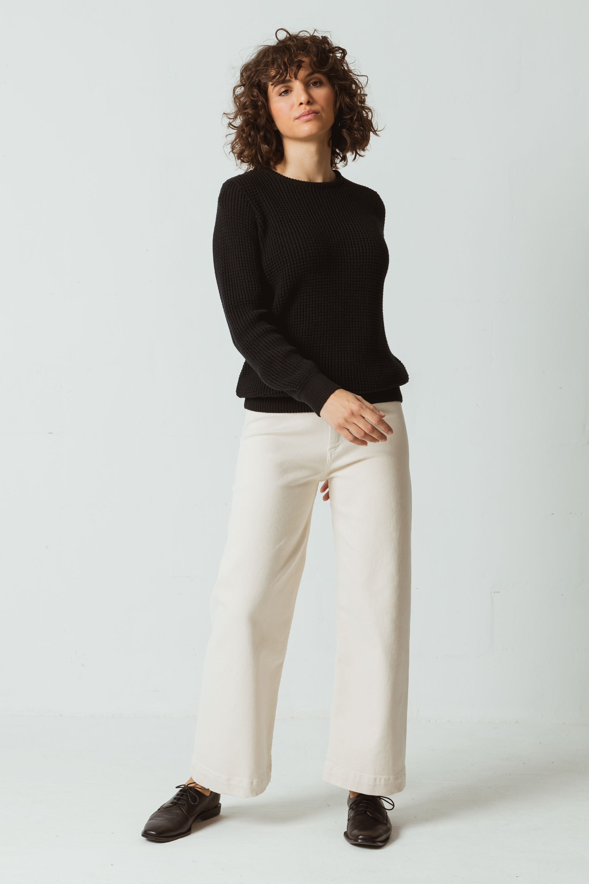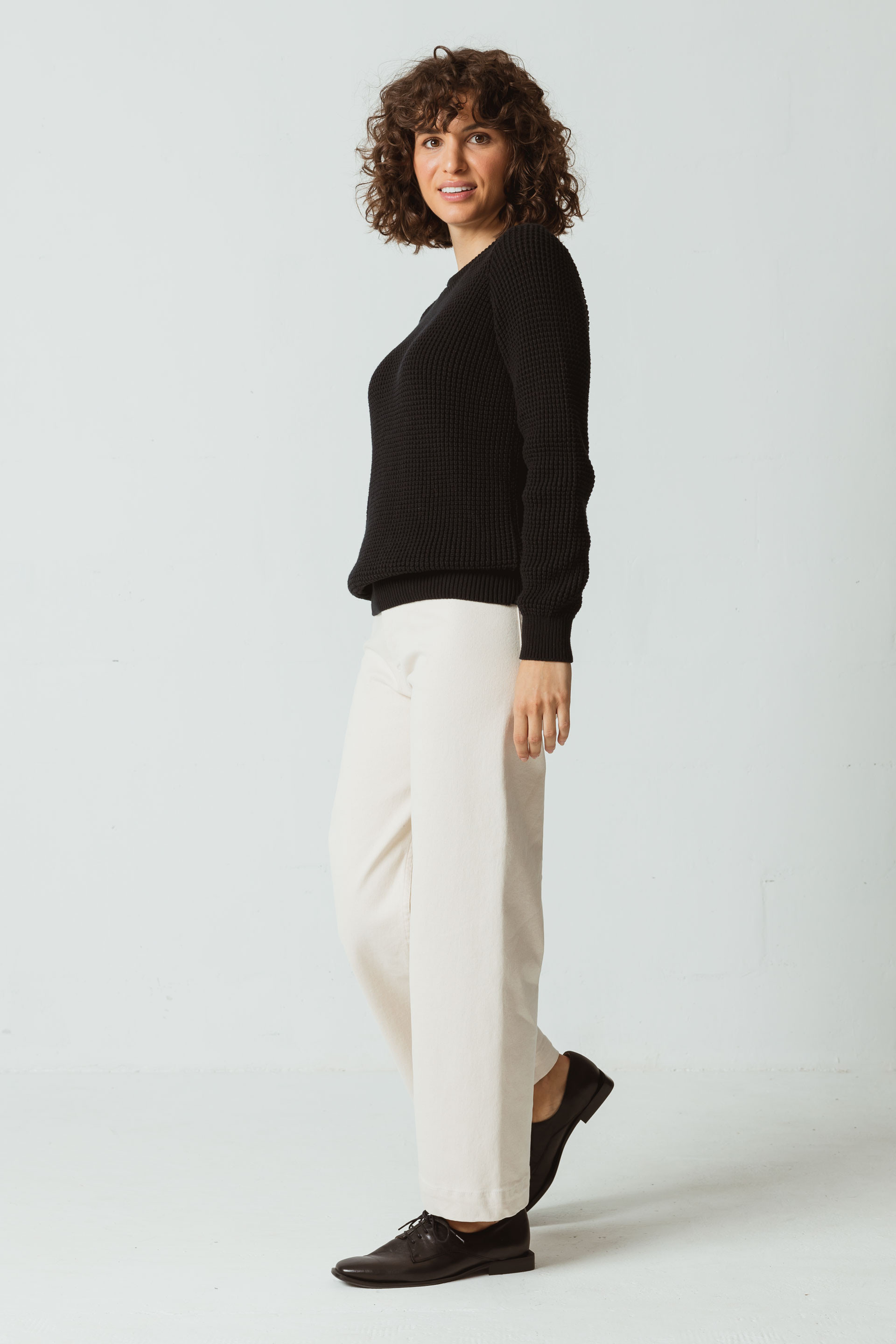 GOTS certified organic cotton knit sweater with a round neck, long sleeves and ribbed trim at the collar, hem and cuffs.