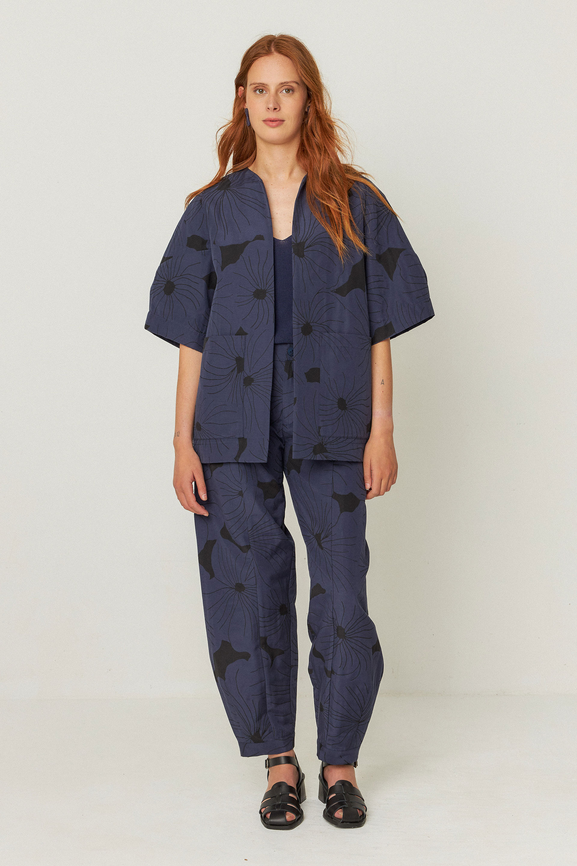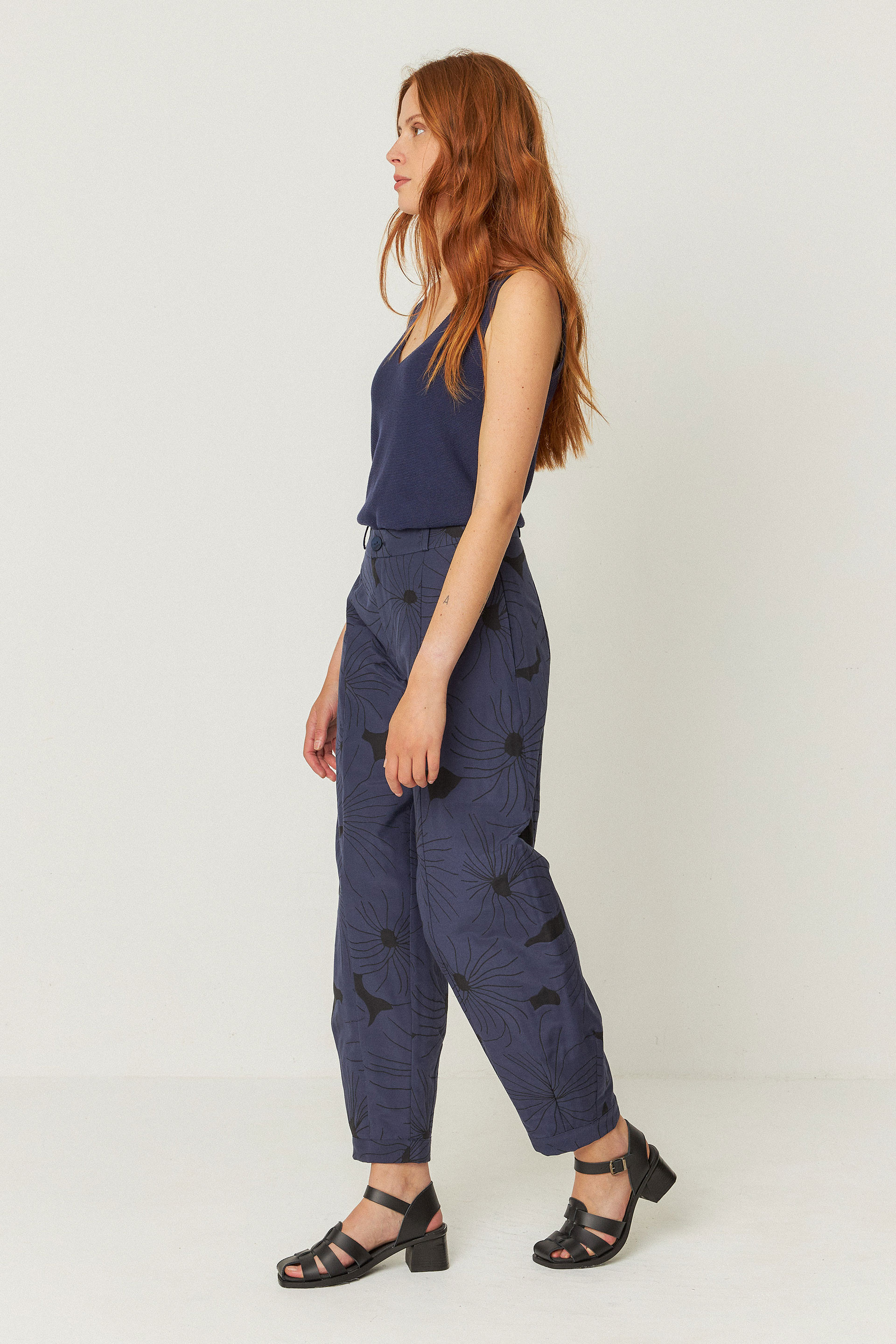 Ankle-length trousers with a relaxed fit and cuffs at the bottom of the leg. They have side pockets with a zip and button closure.