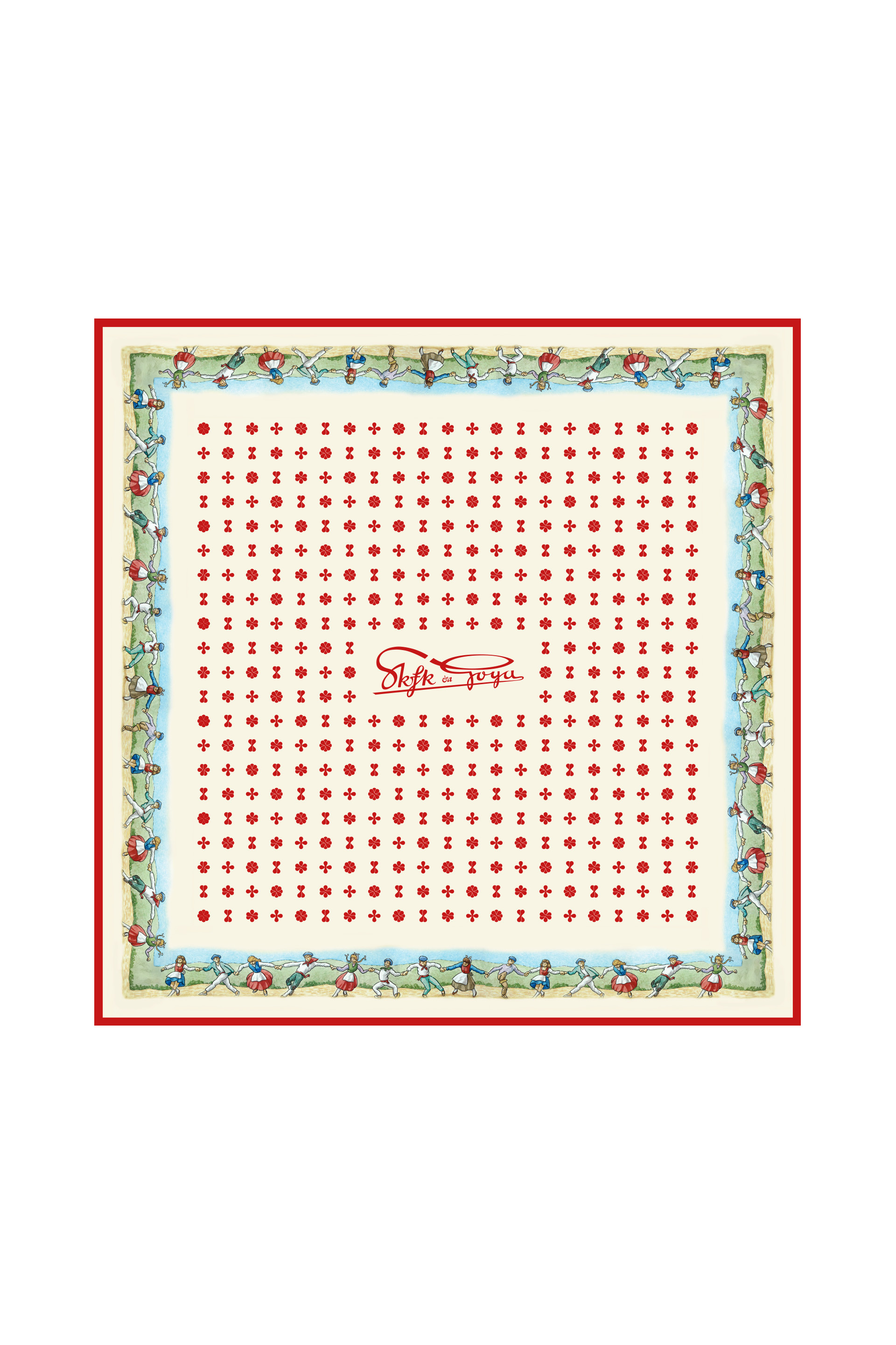 Multicolour crepe scarf with a Vasquitos and Nesquitas band, the historic emblem of Confituras Goya. Hand in hand and dressed in traditional Basque attire, Vasquitos and Nesquitas represent culture, unity and shared celebration.