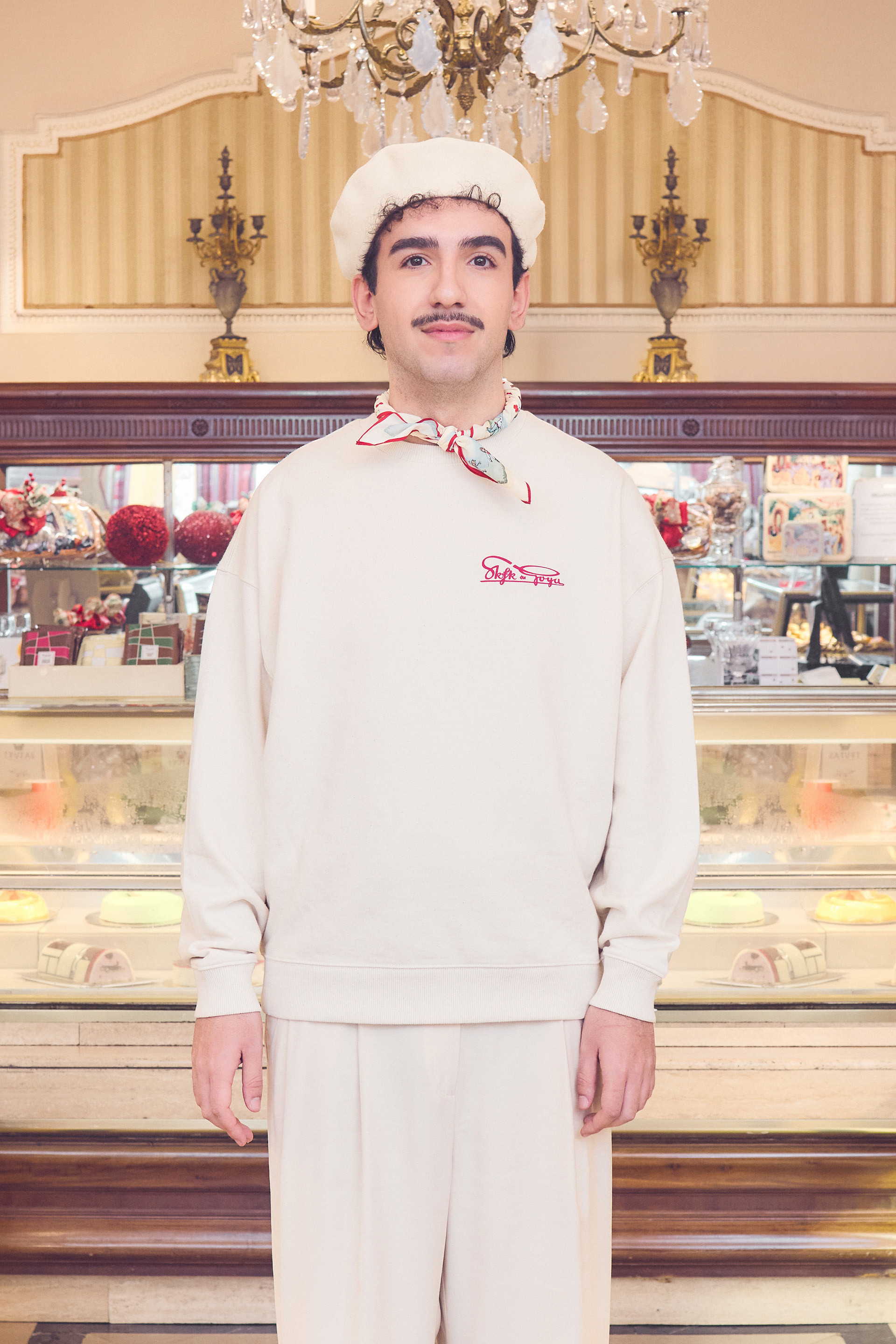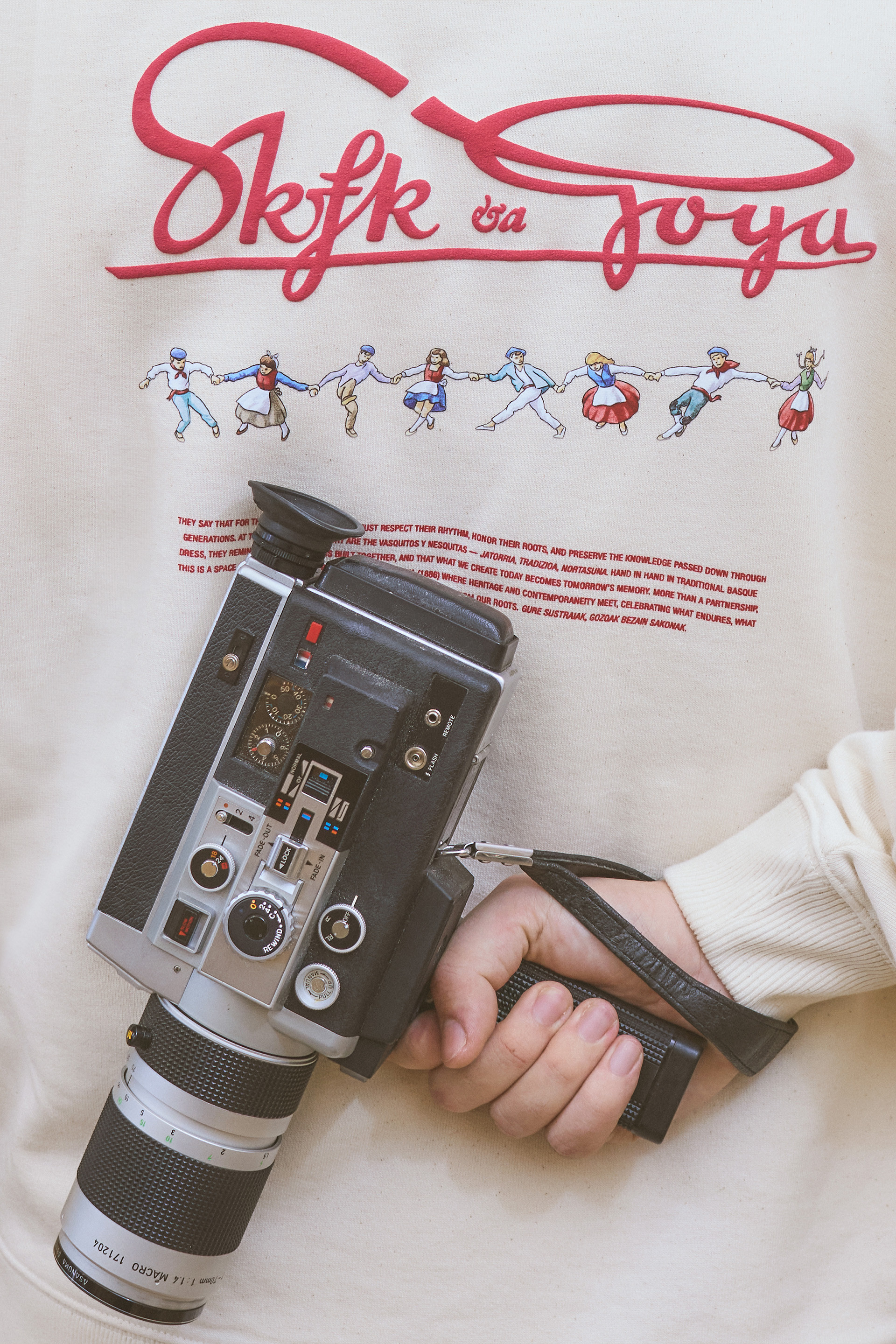 Organic cotton beige sweatshirt featuring the image of Vasquitos and Nesquitas, the historic emblem of Confituras Goya. Hand in hand and dressed in traditional Basque attire, Vasquitos and Nesquitas represent culture, unity and shared celebration.