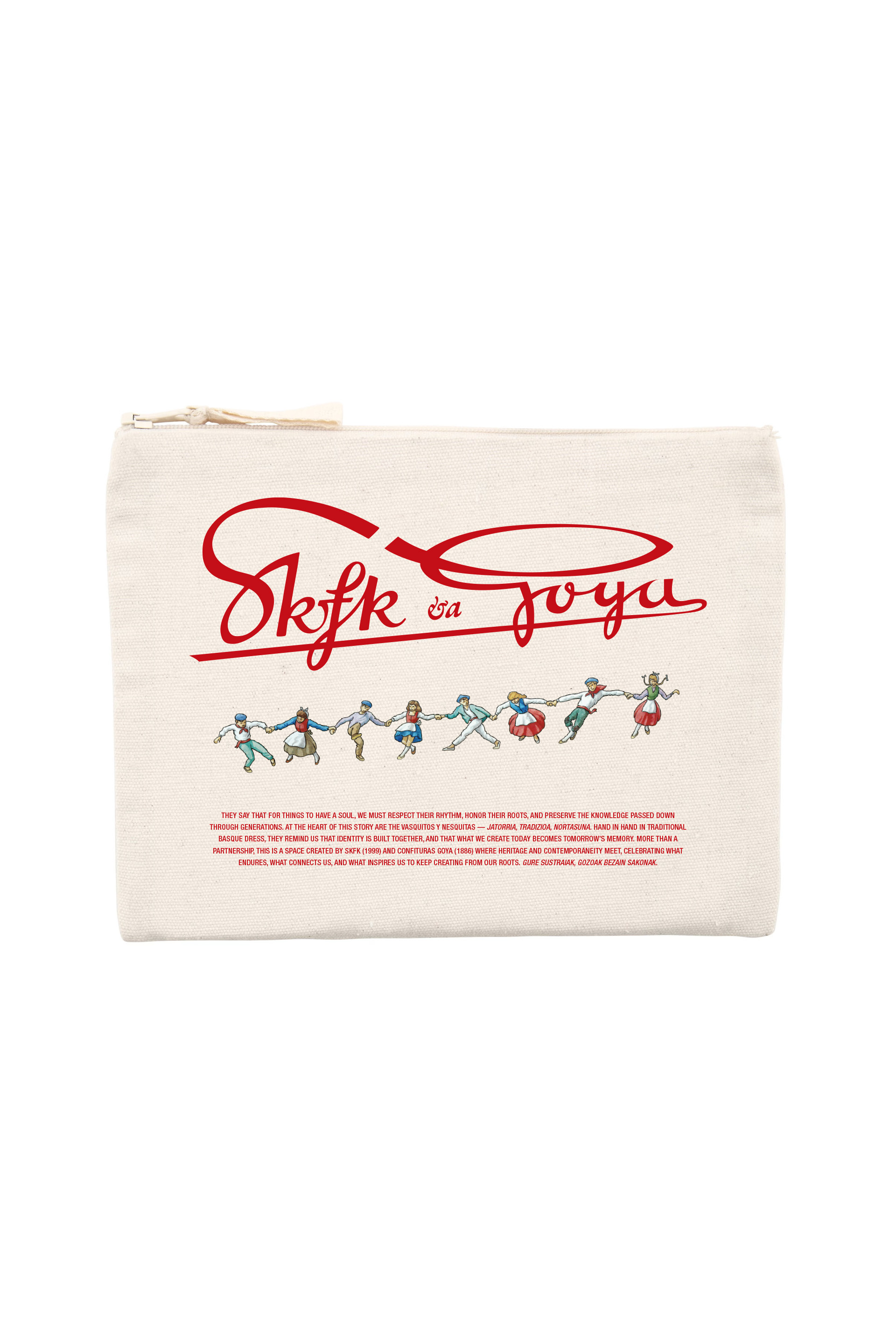 Organic cotton beige toiletry bag featuring the image of Vasquitos and Nesquitas, the historic emblem of Confituras Goya. Hand in hand and dressed in traditional Basque attire, Vasquitos and Nesquitas represent culture, unity and shared celebration.